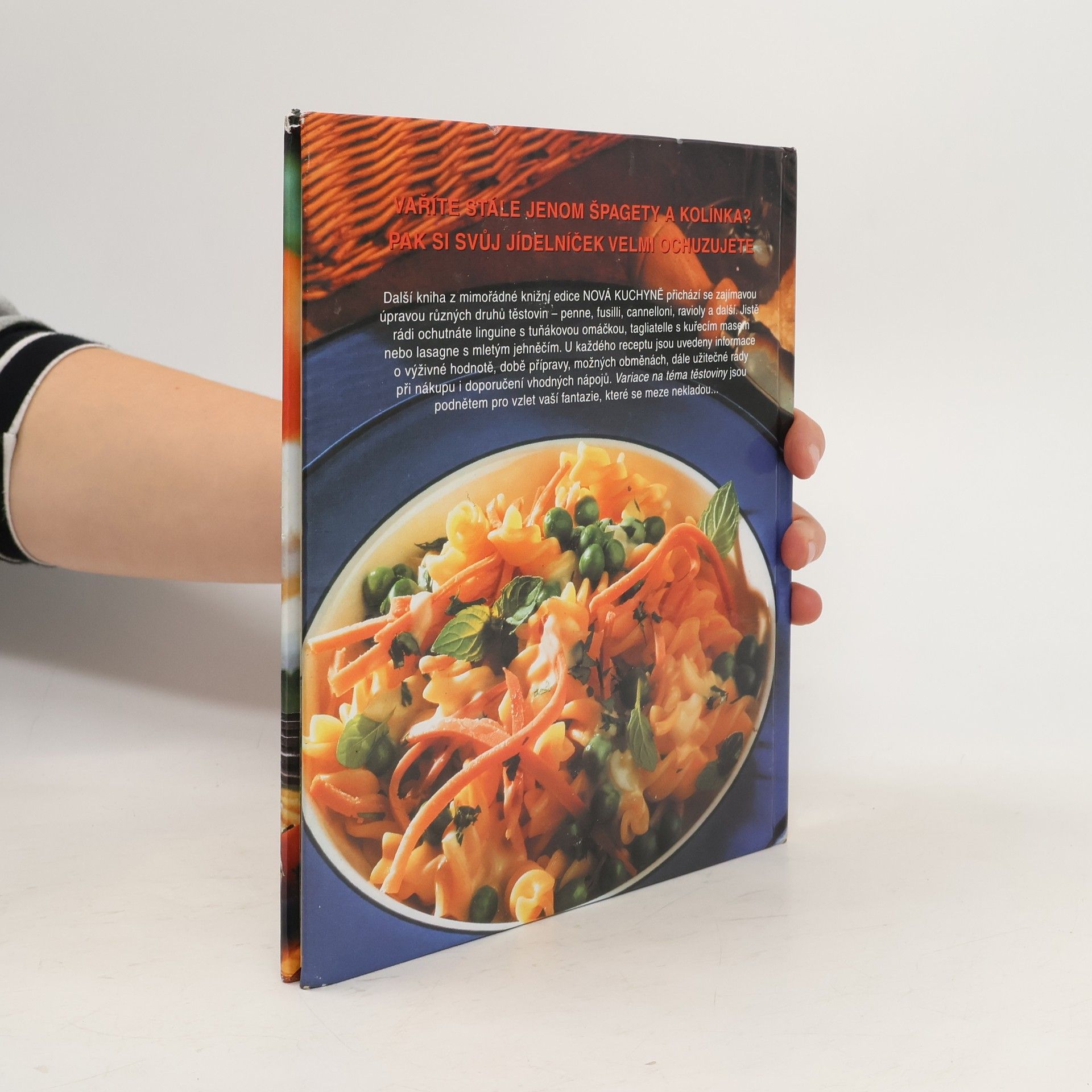 Další kniha z edice Nová kuchyně přichází se zajímavou úpravou různych druhů těstovin - penne, fusilli, cannelloni, ravioli a další. U každého receptu jsou uvedeny informace o výživové hodnotě, době přípravy, možných obměnách a dále užitočné rady při nákupu i doporučení vhodných nápojů