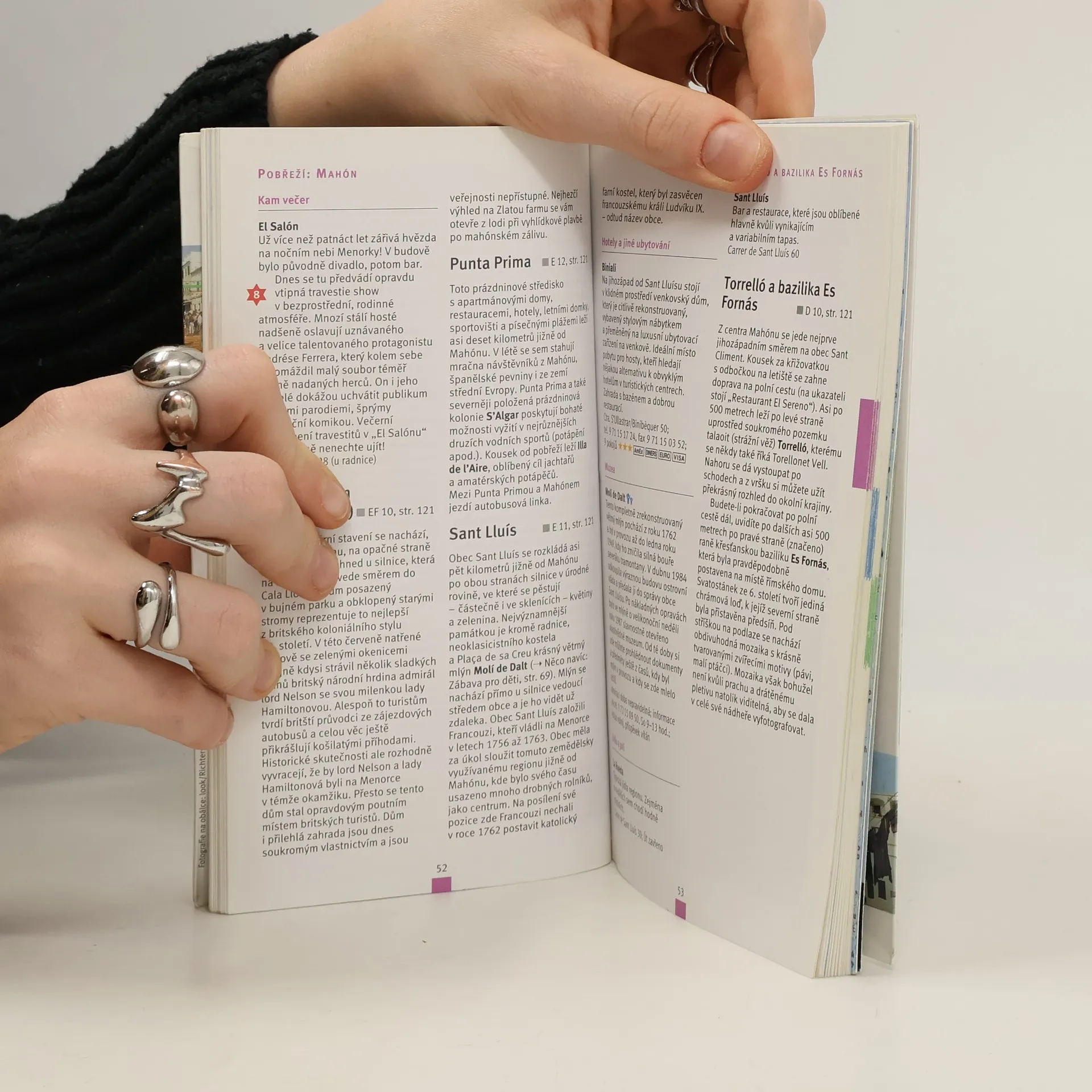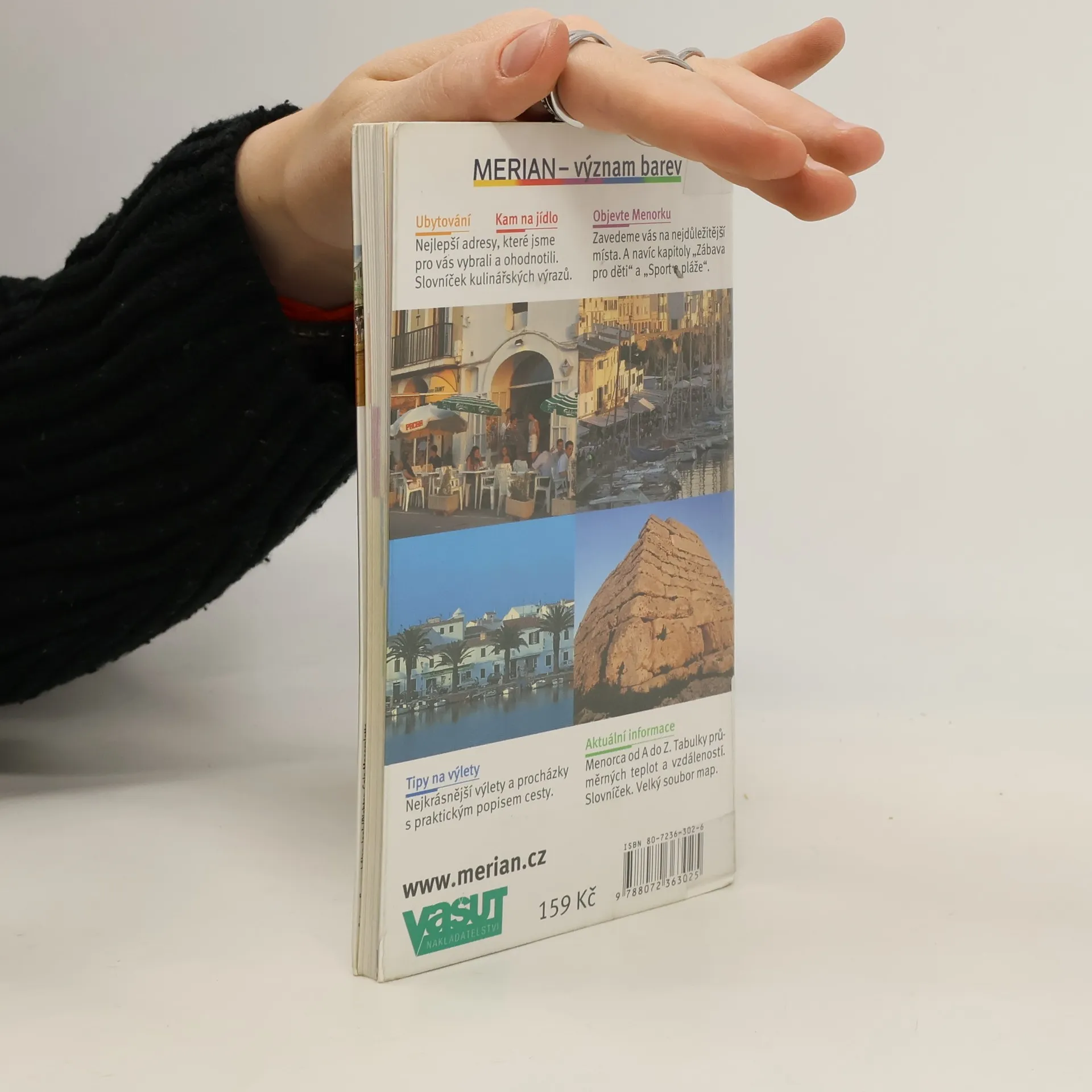 Průvodce po španělském středomořském ostrově Menorca. Český překlad jednoho ze svazků německé ediční řady "Merian live!" popisuje zajímavá místa nejméně známého ostrova ze souostroví Baleár. Popsána jsou zajímavá místa obou "hlavních měst", oficiální metropole Mahónu i historicky významnější Ciutadelly, stejně tak i vnitrozemí ostrova, fjordy severního pobřeží a jednotlivá centra hromadné turistiky a cestovního ruchu, který je zde přece jen o poznání méně hektický než na sousední přeplněné Mallorce. Součástí svazku je i řada praktických informací o ubytovacích a stravovacích zařízeních v jednotlivých městech, otevíracích dobách památkových objektů a muzeí nebo adresách informačních kancelářích. Bohatý fotografický doprovod, plánky měst, cestovní mapa a rejstříkový aparát.