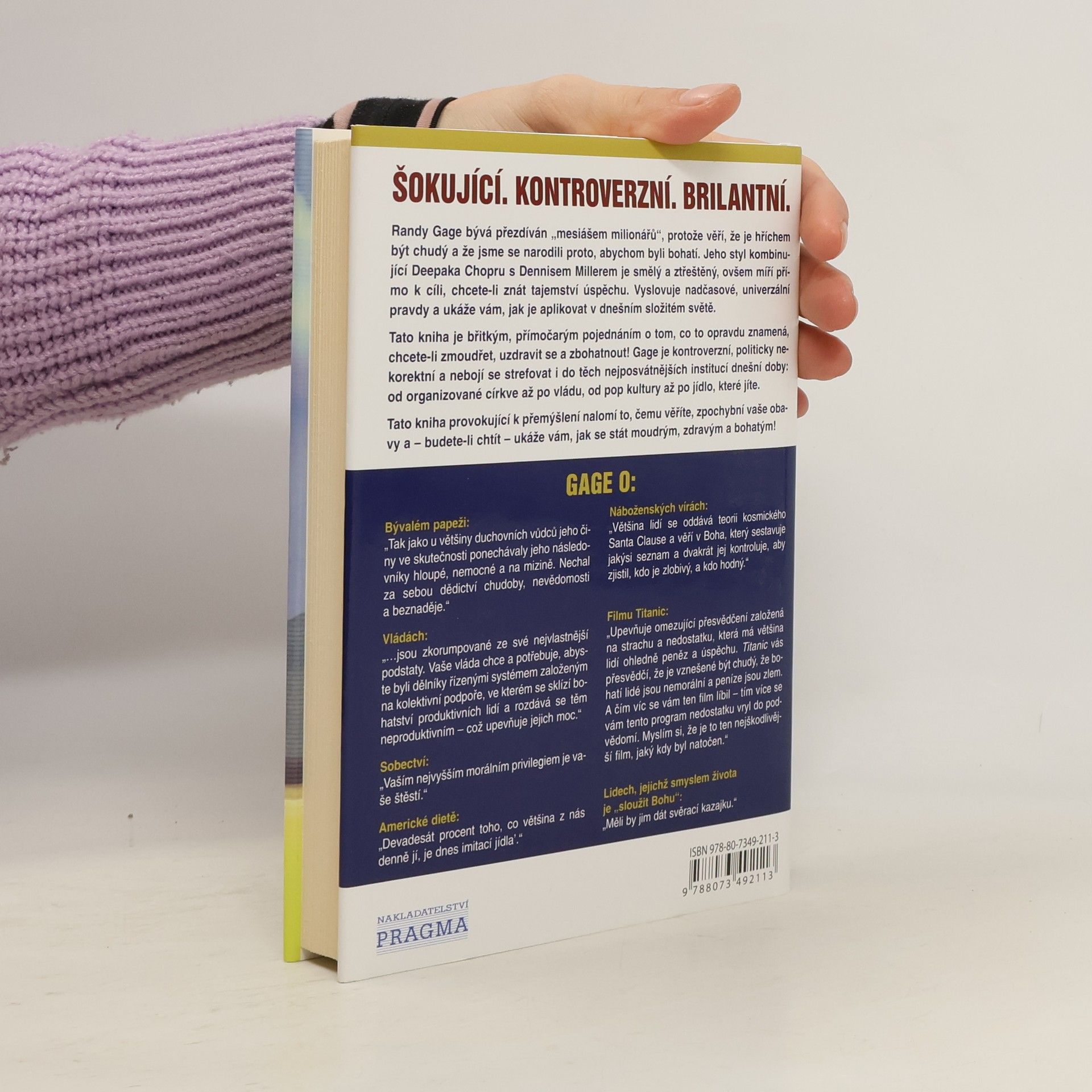Autor vyslovuje nadčasové univerzální pravdy a ukáže vám, jak je aplikovat v dnešním složitém světě. Gage je kontroverzní, politicky nekorektní a nebojí se strefovat i do těch nejposvátnějších institucí dnešní doby od organizované církve až po vládu, od pop kultury až po jídlo, které jíte. Odhaluje tajemství pevného zdraví, štěstí a prosperity v životě - ovšem takovým způsobem, s jakým jste se dosud nesetkali. Tato kniha provokující k přemýšlení nalomí to, čemu věříte, zpochybní vaše obavy a - budete-li chtít - ukáže vám, jak být moudrý, zdravý a bohatý!