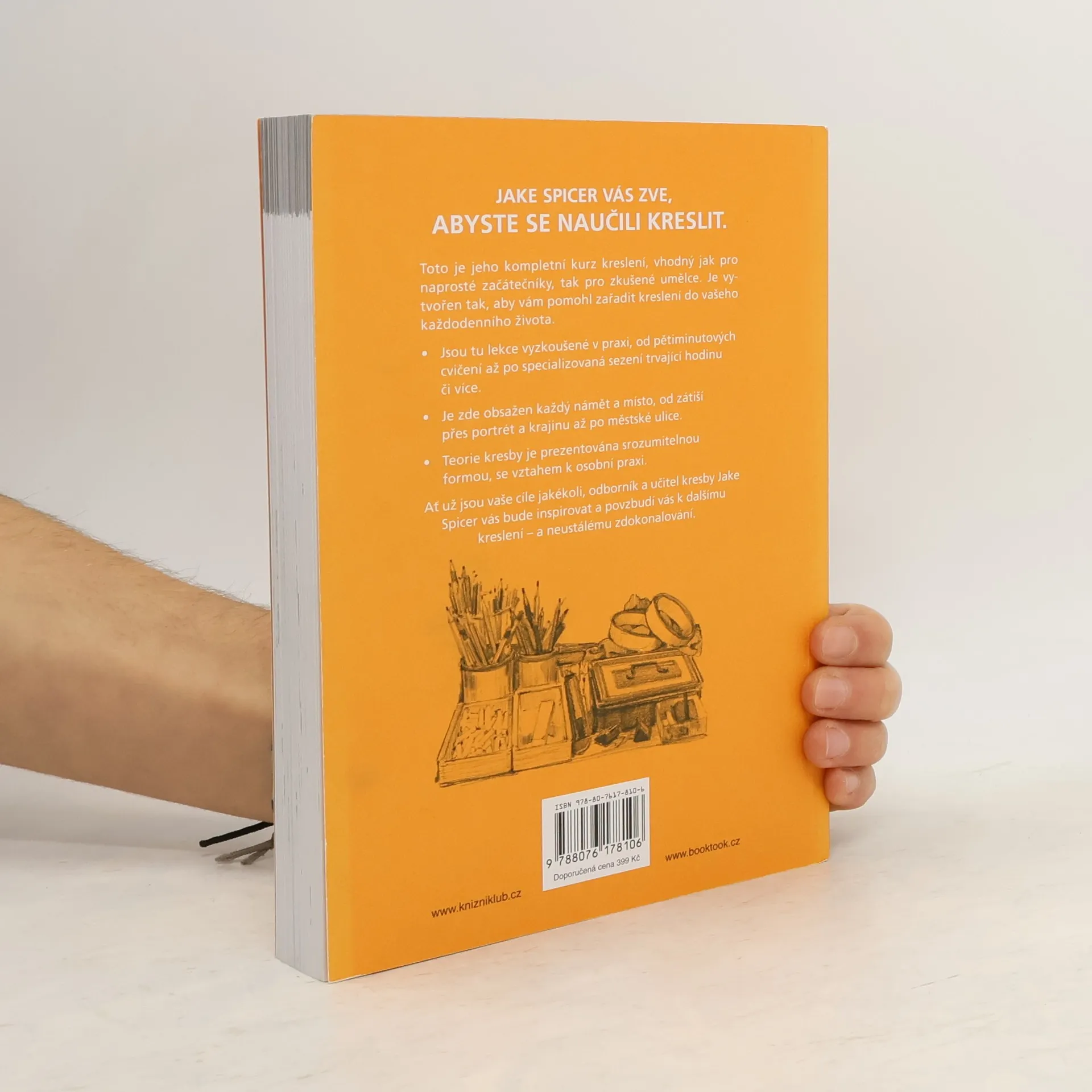 Skicujte a kreslete cokoli, kdekoli. Jake Spicer vás zve, abyste se naučili kreslit! Tento kompletní kurz kreslení je vhodný jak pro naprosté začátečníky, tak pro zkušené umělce. Je vytvořen tak, aby vám pomohl zařadit kreslení do každodenního života. V knize najdete lekce vyzkoušené v praxi, od pětiminutových cvičení až po specializovaná sezení, trvající hodinu či více. Vyzkoušíte si mnoho námětů: od zátiší přes portrét, krajinu až po městské ulice. A to vše srozumitelnou formou, se vztahem k osobní praxi. Ať už jsou vaše cíle jakékoli, odborník a učitel kresby Jake Spicer vás bude inspirovat a povzbudí vás k dalšímu kreslení – a k neustálému zdokonalování.