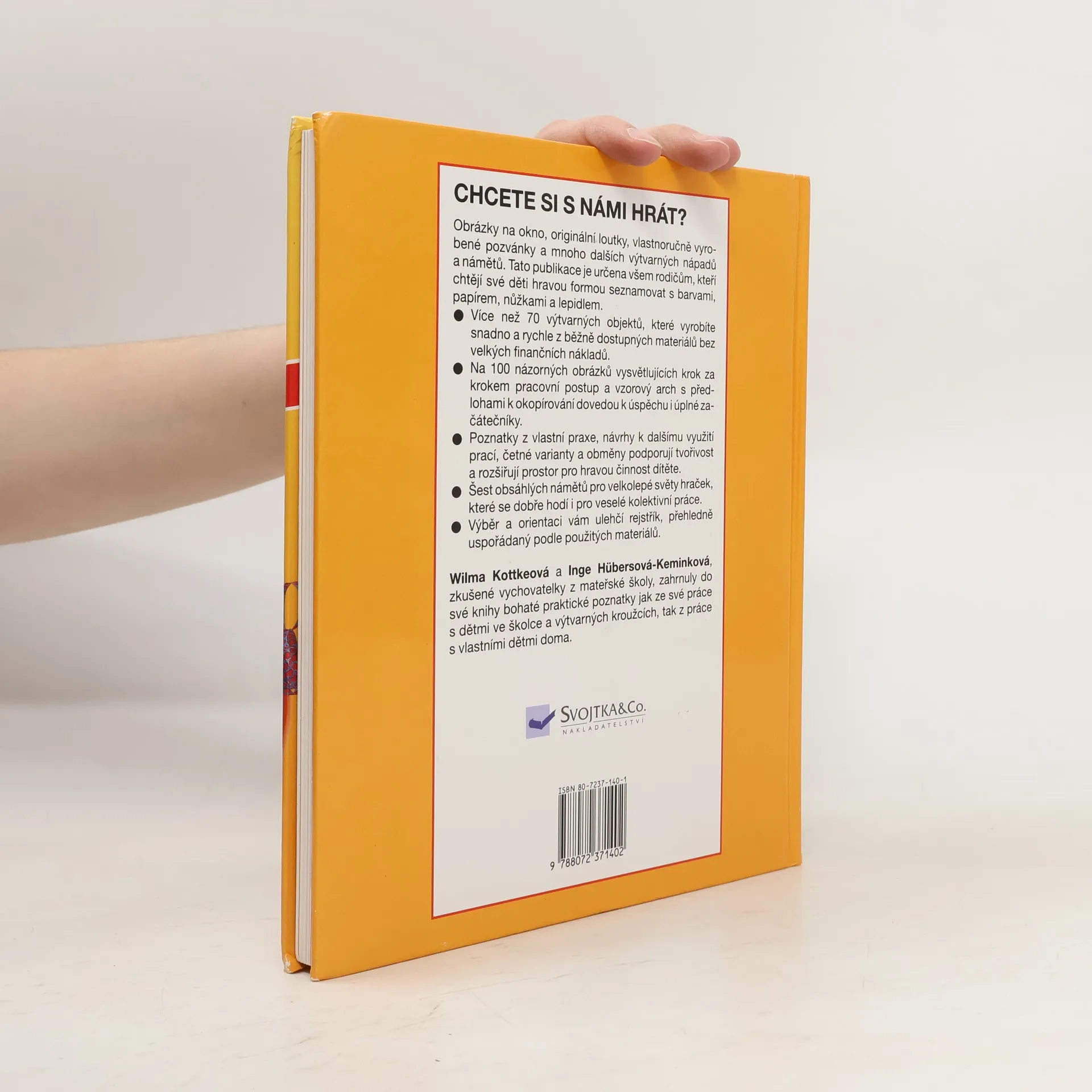 dalších výtvarných nápadů a námětů. Tato publikace'je určena všem rodičům, kteří chtějí své děti hravou formou seznamovat s barvami, papírem, nůžkami a lepidlem. . Více než 70 výtvarných objektů, které vyrobíte snadno a rychle z běžně dostupných materiálů bez velkých finančních nákladů. . Na 100 názorných obrázků vysvětlujících krok za krokem pracovní postup a vzorový arch s předlohami k okopírování dovedou k úspěchu i úplné začátečníky. . Poznatky z vlastní praxe, návrhy k dalšímu využití prací, četné varianty a obměny podporují tvořivost a rozšiřují prostor pro hravou činnost dítěte. . Šest obsáhlých námětů pro velkolepé světy hraček, které se dobře hodí i pro veselé kolektivní práce. . Výběr a orientaci vám ulehčí rejstřík, přehledně uspořádaný podle použitých materiálů.