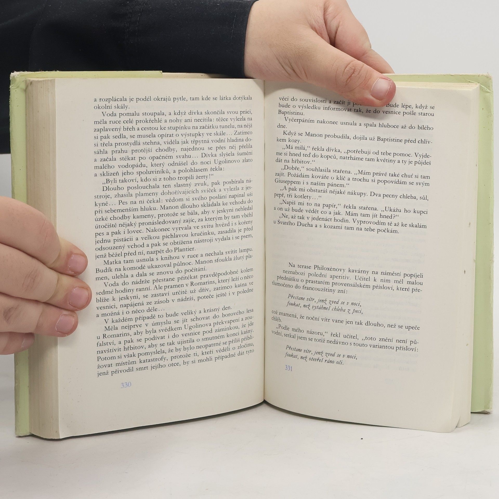 Román z francouzského venkova. Příběh hrbatého berního úředníka, operní zpěvačky a jejich dcerky Manon, kteří se ujmou pochybného dědictví - osamělé usedlosti v horách - dojímá úpornou snahou nezkušených měšťáků zvelebit půdu svých předků a živit se na ni prací vlastních rukou. Marné úsilí pana Jeana nezápasí pouze s nepřízní přírody ale především s lidskou hloupostí a zlobou. Toto drama založené na zločinu a trestu má sílu antické tragedie, jejímiž protagonisty jsou vedle lidí i slepé síly Osudu. Leč nechybí v něm ani katarze, k níž dá podnět nečekané odhalení na konci knihy. Její závěr je ve znamení smíru a naděje.