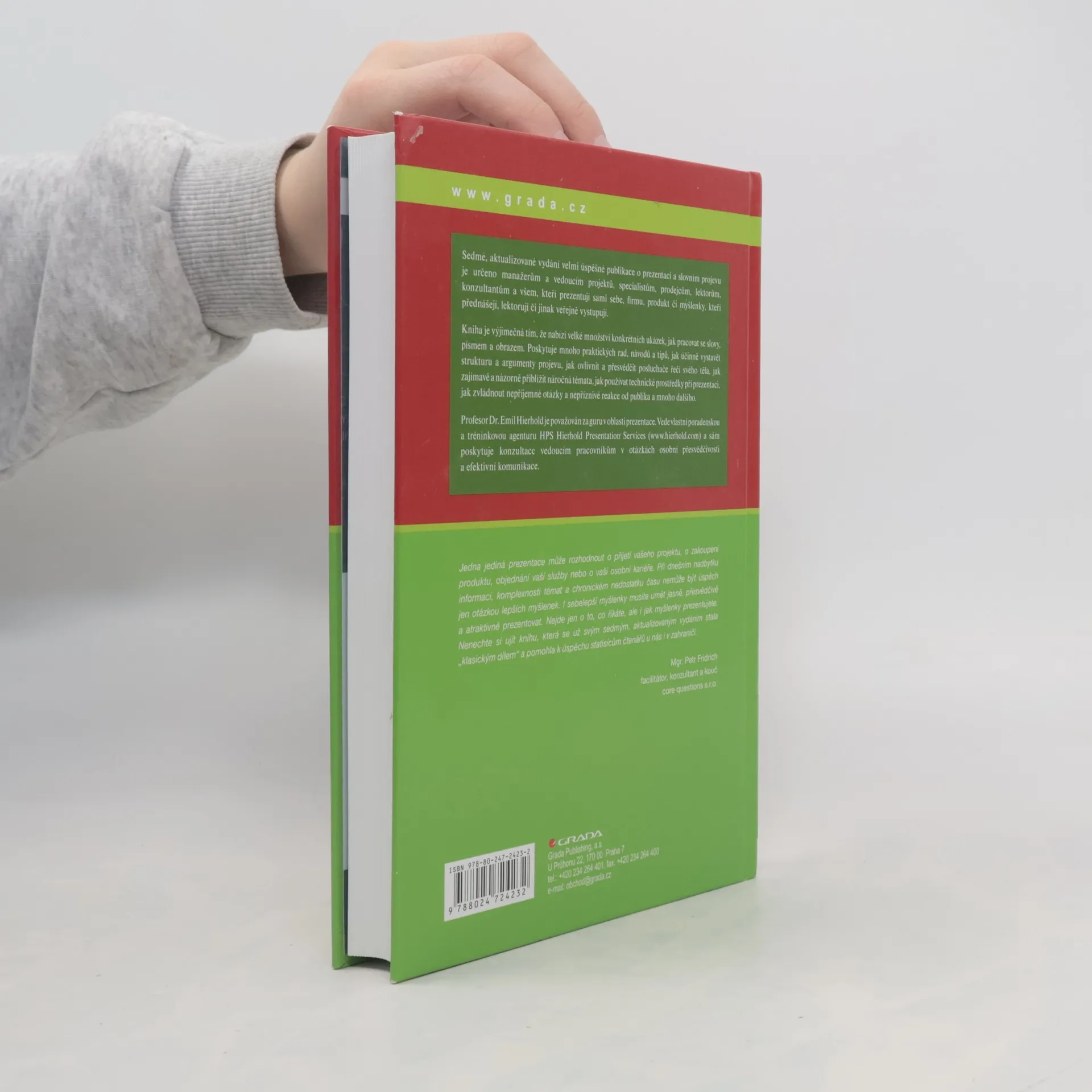Sedmé, aktualizované vydání velmi úspěšné publikace o prezentaci a slovním projevu je určeno manažerům a vedoucím projektů, specialistům, prodejcům, lektorům, konzultantům a všem, kteří prezentují sami sebe, firmu, produkt či myšlenky, kteří přednášejí, lektorují či jinak veřejně vystupují. Kniha je výjimečná tím, že nabízí velké množství konkrétních ukázek, jak pracovat se slovy, písmem a obrazem. Poskytuje mnoho praktických rad, návodů a tipů, jak účinně vystavět strukturu a argumenty projevu, jak ovlivnit a přesvědčit posluchače řečí svého těla, jak zajímavě a názorně přiblížit náročná témata, jak používat technické prostředky při prezentaci, jak zvládnout nepříjemné otázky a nepříznivé reakce od publika a mnoho dalšího.