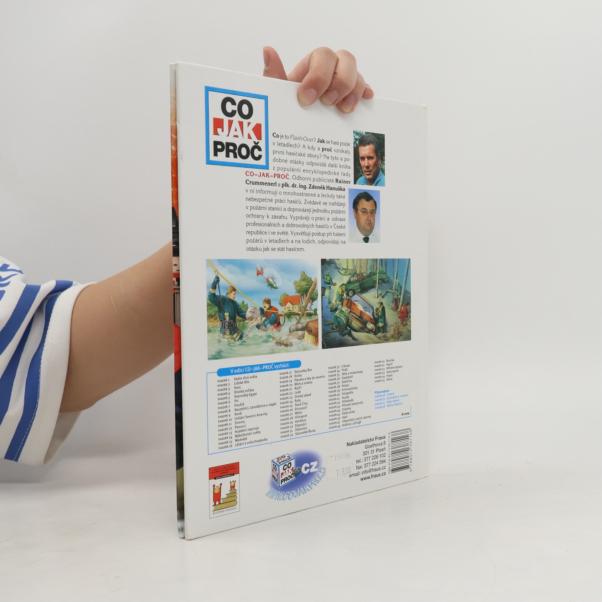 Co je to Flash-Over? Jak se hasí požáry v letadlech? A kdy a proč vznikaly první hasičské sbory? Na podobné otázky odpovídá další kniha z populární encyklopedické řady CO-JAK-PROČ. Publicisté Rainer Crummenerl a plk. dr. ing. Zdeněk Hanuška v ní informují o mnohostranné a leckdy také nebezpečné práci hasičů. Zvědavě se rozhlížejí v požární stanici a doprovázejí jednotku požární ochrany k zásahu. Vyprávějí o práci a odvaze profesionálních a dobrovolných hasičů v ČR i ve světě. Vysvětlují postup při hašení požárů v letadlech a na lodích a odpovídají na otázku jak se stát hasičem.