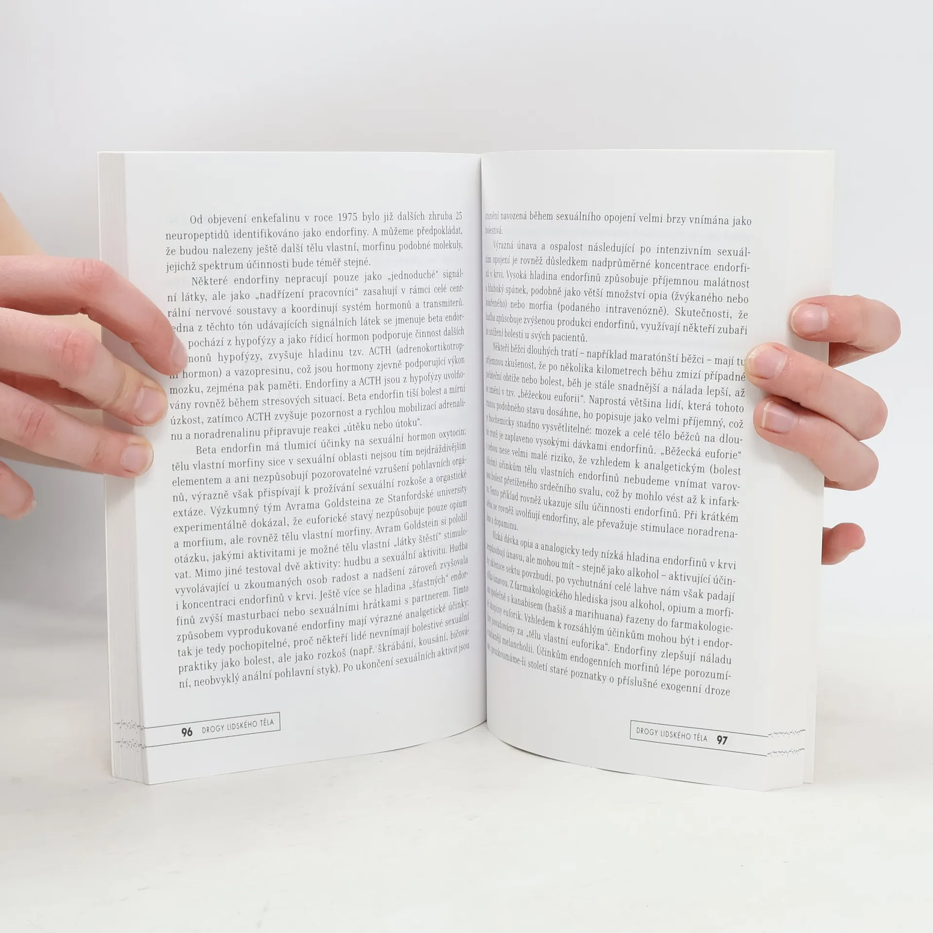Drogy lidského těla bez vedlejších účinků. Mnozí lidé si navykli používat k ovlivnění své výkonnosti či svého prožívání psychofarmaka. Málokdo si je však vědom toho, že lidské tělo produkuje vlastní substance, které působí jako antidepresiva, anxiolytika, stimulanty, tišicí prostředky apod. Autor popisuje názorně biochemické pochody v lidském těle a účinek "drog", které naše tělo produkuje. Nabízí zároveň čtenáři řadu podnětů, jak tyto látky vlastní našemu tělu zdravým způsobem aktivovat a využít - bez jakýchkoli vedlejších účinků. Knihu využijí lékaři, psychologové, psychoterapeuti, čtenáři se zájmem o sebepoznání a práci na sobě.