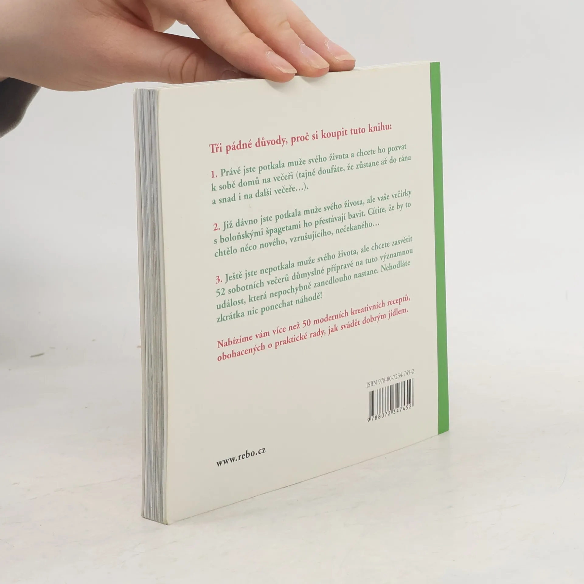 Právě jste potkala muže svého života a chcete ho pozvat k sobě domů na večeři (tajně doufáte, že zůstane až do rána a snad i na další večeře...). Již dávno jste potkala muže svého života, ale vaše večírky s boloňskými špagetami ho přestávají bavit. Cítíte, že by to chtělo něco nového, vzrušujícího, nečekaného.. Ještě jste nepotkala muže svého života, ale chcete zasvětit 52 sobotních večerů důmyslné přípravě na tuto významnou událost, která nepochybně zanedlouho nastane. Nehodláte zkrátka nic ponechat náhodě. Nabízíme více než 50 moderních kreativních receptů obohacených o praktické rady jak svádět dobrým jídlem.