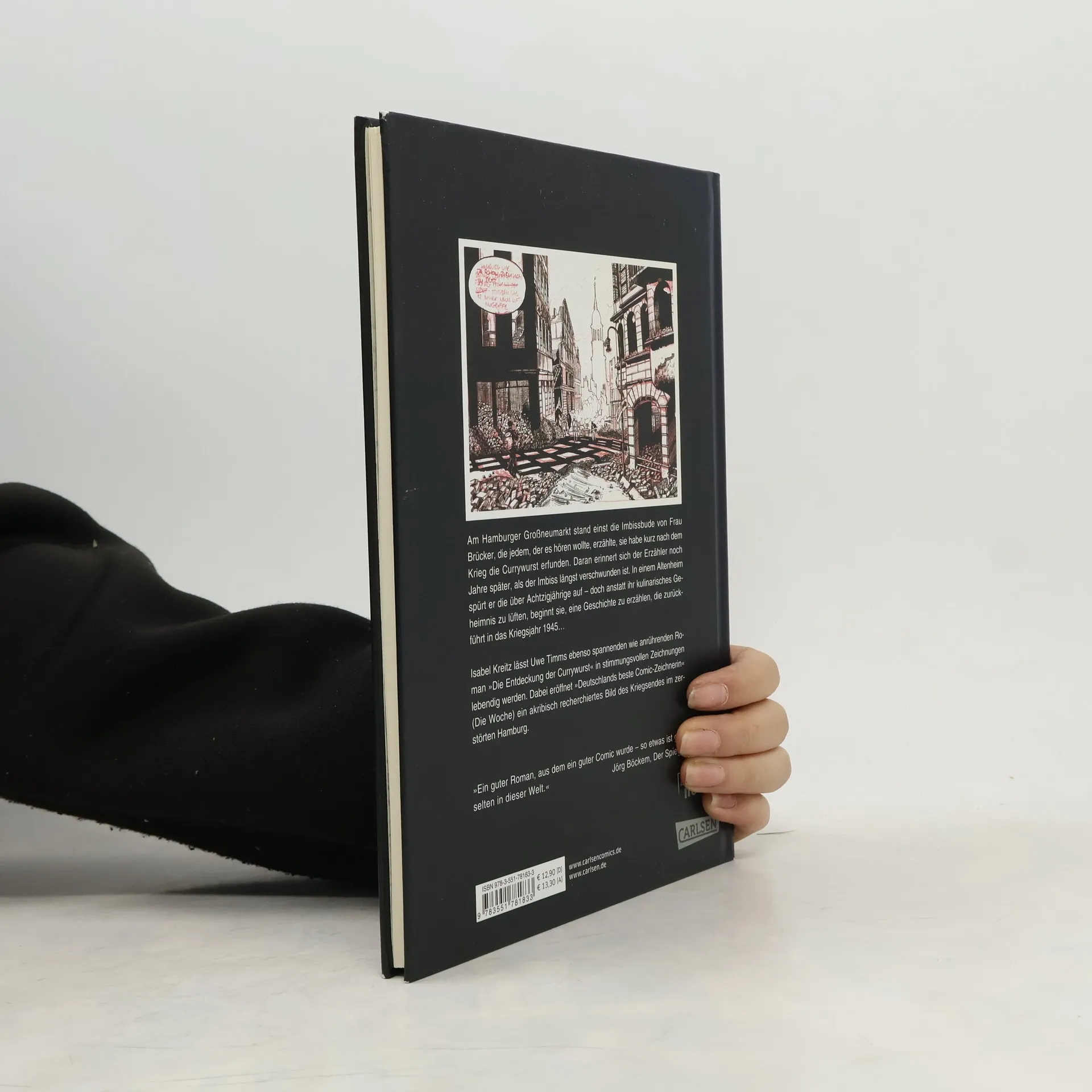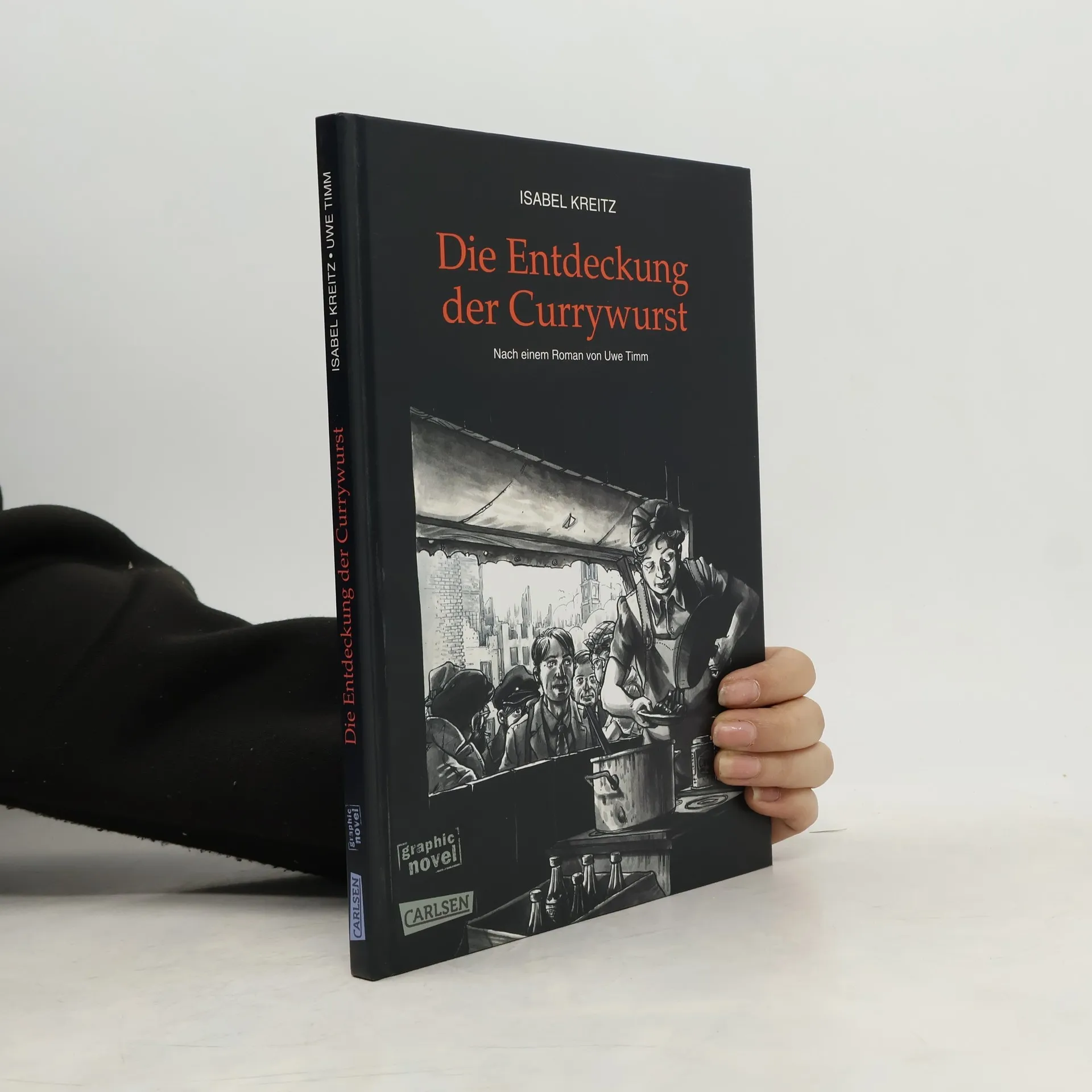 Am Hamburger Großneumarkt stand einst die Imbissbude von Frau Brücker, die jedem, der es hören wollte, erzählte, sie habe kurz nach dem Krieg die Currywurst erfunden. Daran erinnert sich der Erzähler noch Jahre später als der Imbiss längst verschwunden ist. In einem Altenheim spürt er die über Achtzigjährige auf, doch anstatt ihr kulinarisches Geheimnis zu lüften, beginnt sie, eine Geschichte zu erzählen, die zurückführt in das Kriegsjahr 1945. Isabel Kreitz lässt Uwe Timms ebenso spannenden wie anrührenden Roman »Die Entdeckung der Currywurst« in stimmungsvollen Zeichnungen lebendig werden. Dabei eröffnet »Deutschlands beste Comic-Zeichnerin« (Die Woche) ein akribisch recherchiertes Bild des Kriegsendes im zerstörten Hamburg. Die hochwertige Neuausgabe beinhaltet zudem einen umfangreichen Anhang, der die dramatischen Ereignisse des Kriegsendes in Hamburg dokumentiert. Die Verfilmung der „Entdeckung der Currywurst“ kommt im September 2008 in die deutschen Kinos. In den Hauptrollen spielen Barbara Sukowa und Alexander Khuon.