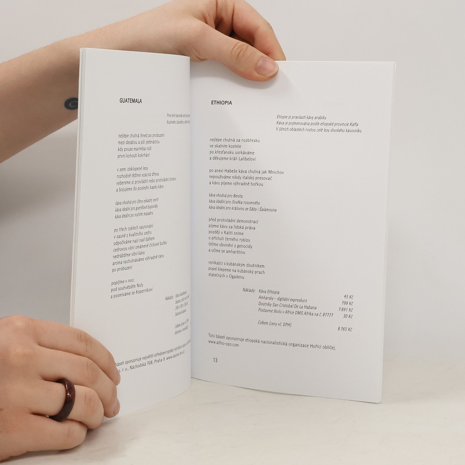 Máte chuť na dobrou kávu, ale nevíte, kterou si vybrat a jak ji správně uvařit? Toužíte se zdokonalit ve znalosti nejznámějších kávových odrůd Afriky, Asie, Ameriky a Oceánie? Chcete se dozvědět, jak efektivně použít ruční kafemlýnek? Potom je Kafegrafie, příručka pro milovníky kávy, určená právě vám! Ondřej Zajac, který kouzlu kávy zcela propadl při studiích na Balkáně, seznamuje čtenáře s historií kávy a její výrobou, přináší řadu zajímavostí o kávě i několik receptů na výborné vícedruhové kávy. Nechybí rozsáhlý poznámkový aparát, který čtenáře odkazuje na množství podnětné literatury spojené s kávou. Kafegrafie, konceptuální příručka, která (zdaleka nejen) svou ironizující a promyšlenou angažovaností přináší nový impuls do diskuzí o současné poezii, je knihou, která by neměla chybět v žádné domácnosti!