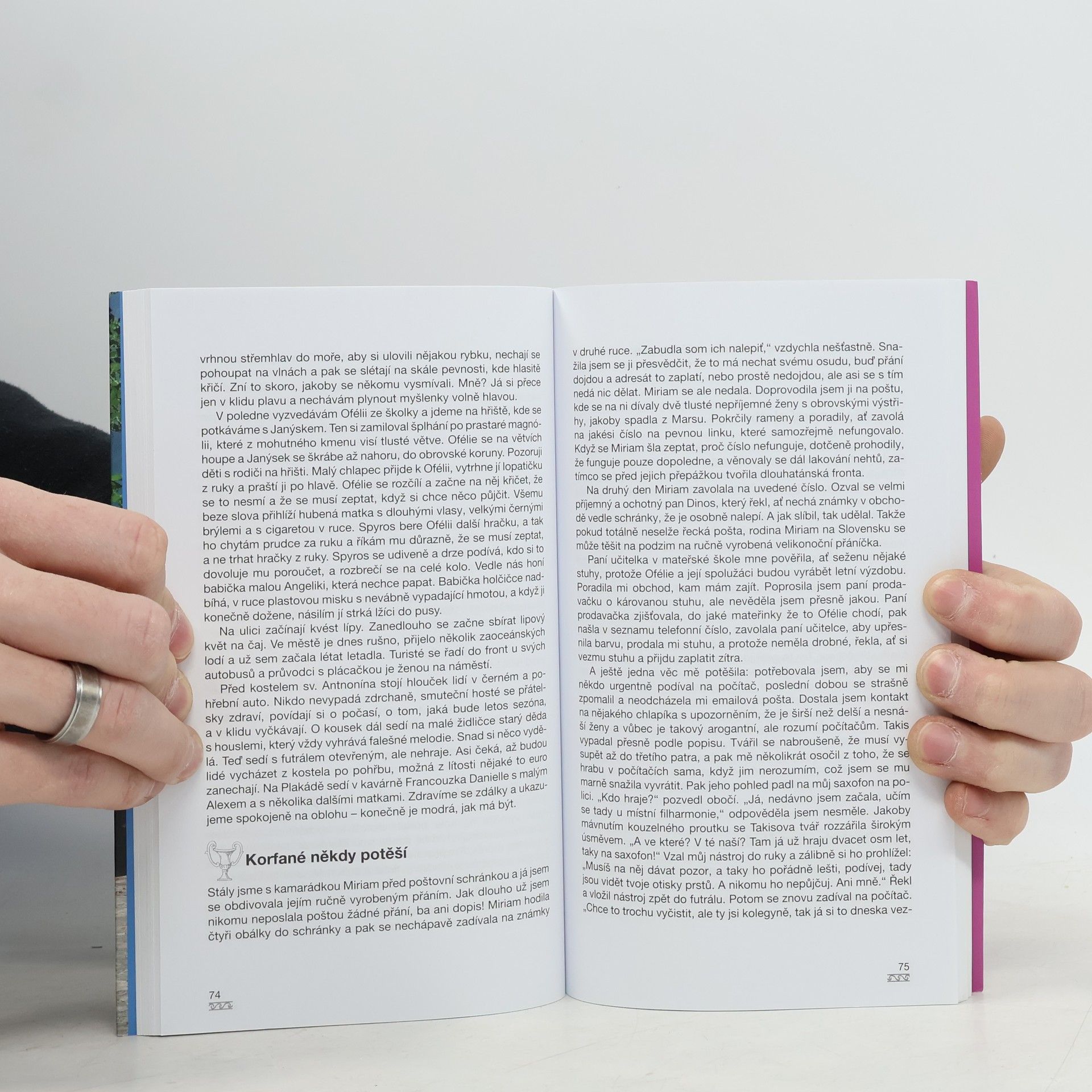 Další autorčino vyprávění o rodině, přátelích a každodenním životě na ostrově Korfu, kde před lety našla díky manželovi svůj druhý domov. Pavla Smetanová opět s humorným nadhledem líčí své příhody a zážitky s manželem a dvěma dětmi, turisty, o které se přes léto stará, přáteli i obyvateli hlavního města Korfu Kerkyry, kde bydlí. Zajímavé je také její popisování řeckých tradic, zvyků, počasí, aktuálních událostí a způsobu života a myšlení vůbec, včetně toho, jak to chodí na úřadech, ve škole apod. Stranou autorčina vypravěčského zájmu nezůstávají ani přírodní, architektonické a jiné půvaby Kerkyry a celého ostrova.
