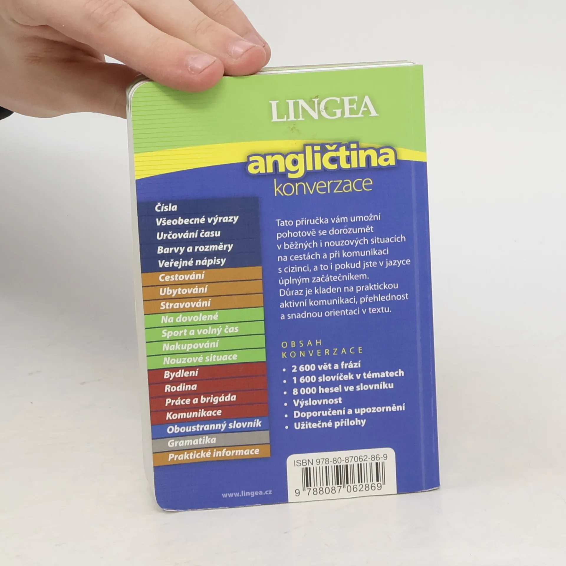 tato příručka vám umožní pohotově se dorozumět v běžných i nouzových situacích na cestách a při komunikaci s cizinci, a to i pokud jste v jazyce úplným začátečníkem. Důraz je kladen na praktickou a snadnou orientaci v textu. Obsah konverzace: 2600 vět a frází, 1600 slovíček v tématech, 8000 hesel ve slovníku, výslovnost, doporučení a upozornění, užitečné přílohy. Konverzace je rozdělena do následujících oddílů: Čísla, Všeobecné výrazy, Určování času, Barvy a rozměry, Veřejné nápisy, Cestování, Ubytování, Stravování, Na dovolené, Sport a volný čas, Nakupování, Nouzové situace, Bydlení, Rodina, Práce a brigáda, Komunikace, Oboustranný slovník, Gramatika, Praktické informace.