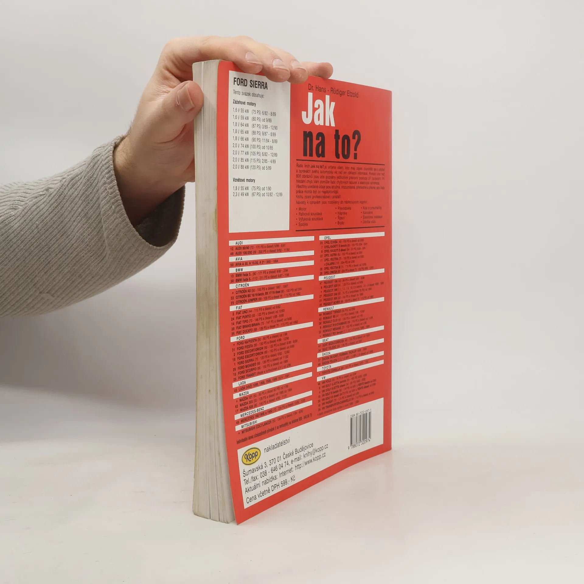 Příručka popisuje údržbu a opravy automobilu Ford Sierra a je vhodná pro profesionály i amatéry. Publikace obsahuje přibližně 800 obrázků, 50 tabulek a elektrických schémat. Kniha je rozčleněna do těchto kapitol: Motor. Mazání motoru. Chlazení motoru. Palivová soustava. Karburátory. Vstřikovací zařízení. Vznětový motor. Výfuková soustava. Spojka. Převodovka. Automatická převodovka. Přední náprava. Zadní náprava. Řízení. Geometrie kol. Brzdy. Kola a pneumatiky. Karosérie. Topení. Elektrická zařízení. Zapalování. Osvětlení. Přístroje. Stírače. Nářadí. Péče o vozidlo. Údržba vozidla. Schémata elektrického zapojení vozu. Kniha popisuje tyto vozy: FORD SIERRA 1,6 l / 55 kW ( 75 PS) LCS/LCT/LSD 06/82-08/89 1,6 l / 59 kW ( 80 PS) L6B 09/89-02/93 KAT 1,8 l / 64 kW ( 87 PS) R2C 03/89-12/90 KAT 1,8 l / 65 kW ( 88 PS) - 09/87-08/89 KAT 1,8 l / 66 kW ( 90 PS) REB 11/84-08/89 2,0 l / 74 kW (100 PS) NE5/N4B 10/85-02/93 KAT 2,0 l / 77 kW (105 PS) NET 06/82-04/89 2,0 l / 77 kW (105 PS) N8C 05/89-12/89 2,0 l / 85 kW (115 PS) N4A 02/85-04/89 2,0 l / 88 kW (120 PS) N9C 05/89-02/93 KAT FORD SIERRA diesel/turbodiesel 1,8 l / 55 kW ( 75 PS) RFB/RFL 01/90-02/93 2,3 l / 49 kW ( 67 PS) YTR 10/82-12/89