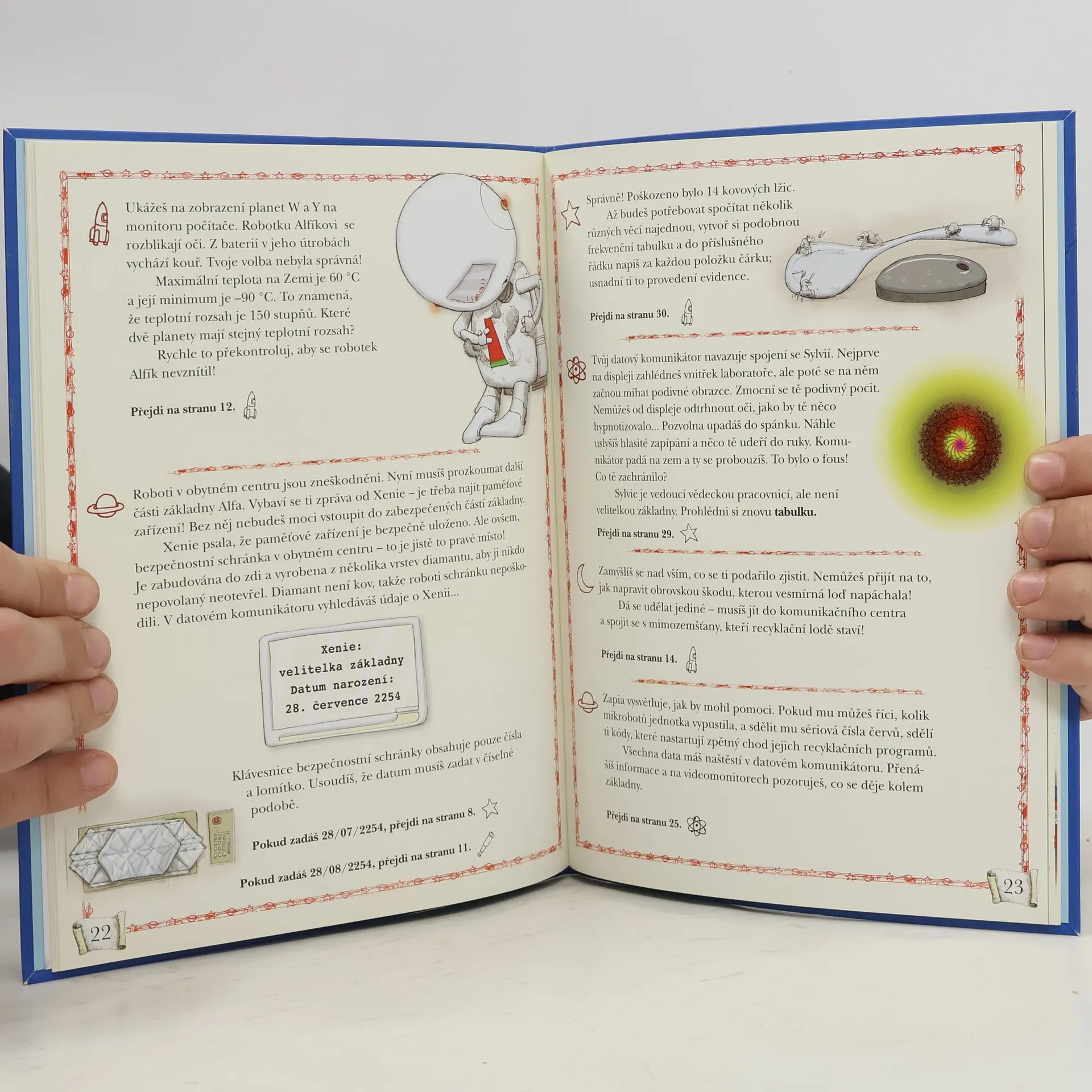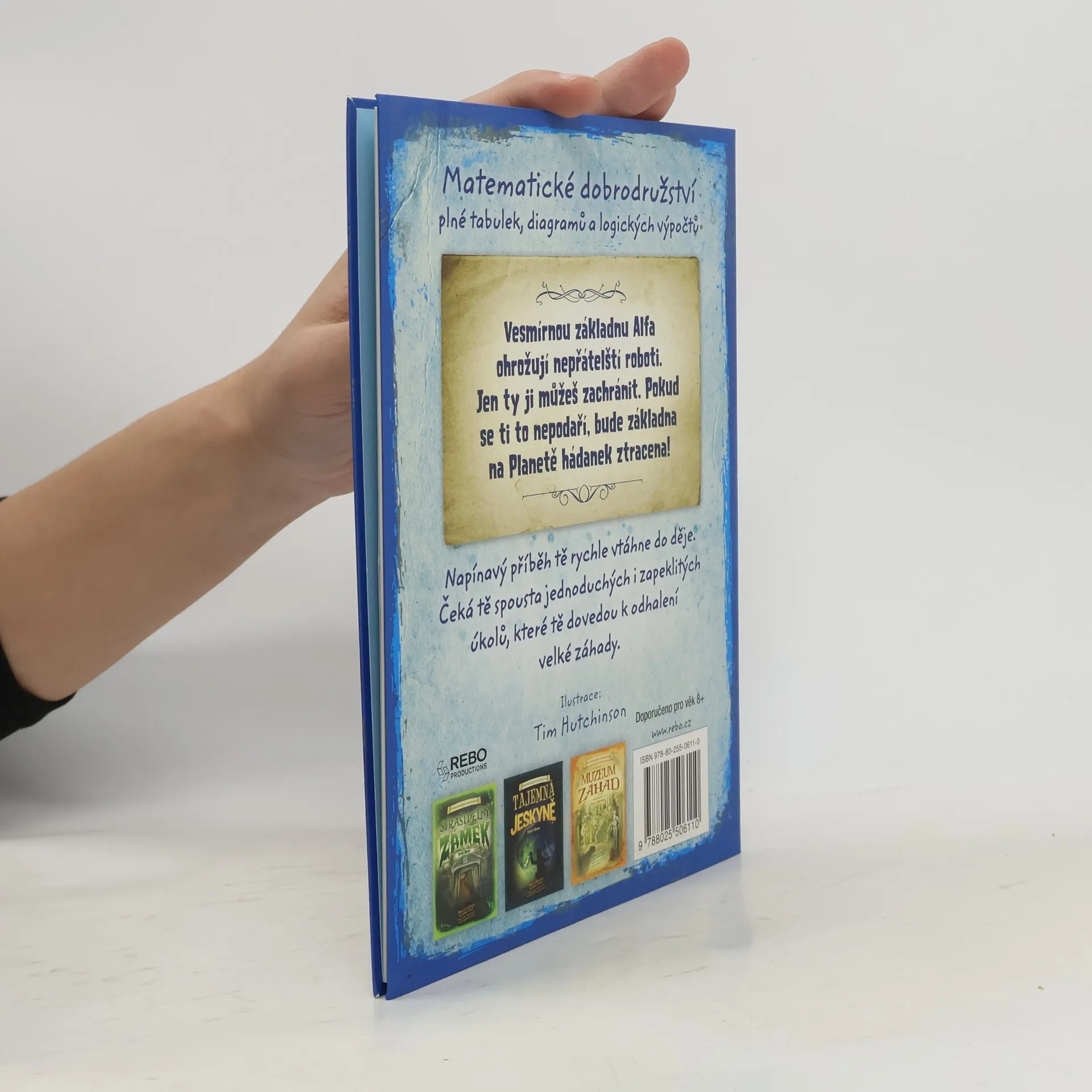 Tato knížka přenese malého čtenáře na Planetu hádanek. Čeká ho nelehký úkol - záchrana vesmírné základny Alfa před nepřátelskými roboty. Podaří se mu pomocí matematických znalostí a bystré mysli nad roboty zvítězit? Jestli někdy zaváhá, nevadí, je tu ještě robotek Alfík, která mu rád přispěchá na pomoc. Knížky z edice Dobrodružná matematika jsou specifické svou formou - nečtou se chronologicky po stránkách za sebou, ale čtenář listuje a posupuje podle toho, jak řeší jednotlivé úkoly. Se správnou odpovědí se posune dál v ději příběhu, vinou špatné odpovědi zabloudí, ale je nasměrován k opětovnému řešení úlohy.