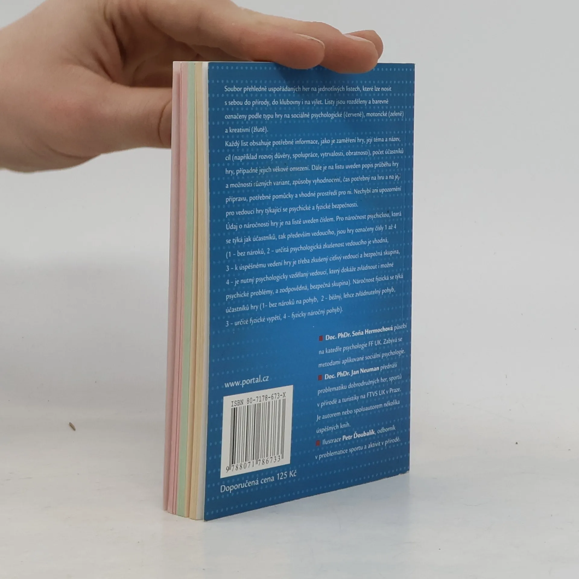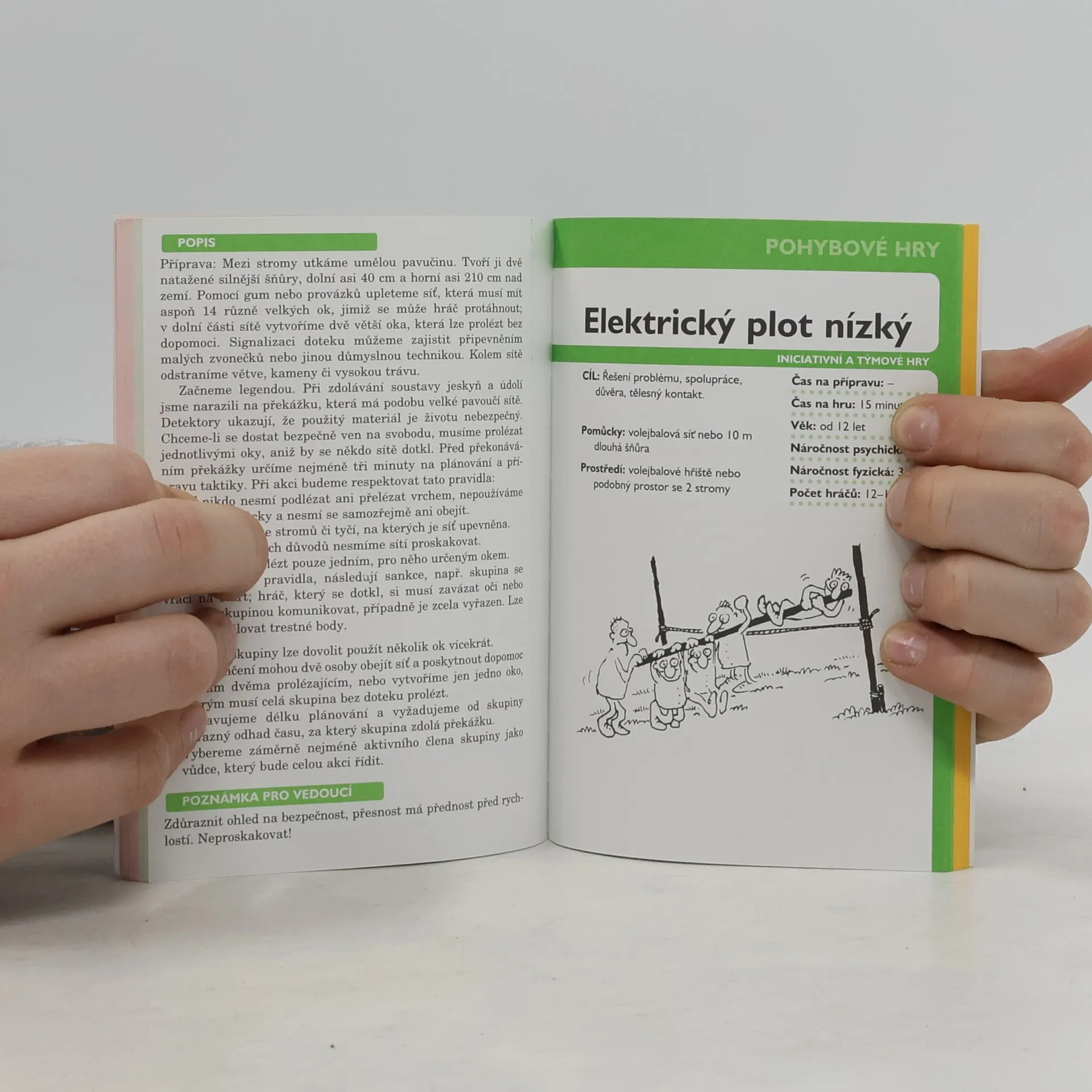 Soubor přehledně uspořádaných her ana jednotlivých listech, které lze nosit s sebou do přírody, do klubovny i na výlet. Listy jsou rozděleny a barevně označeny podle typu hry na soicálně psychologické (červeně), motorické (zeleně) a kreativní (žlutě). Každý list obsahuje potřebné informace, jako ja zaměření hry, její téma a název, cíl, počet účastníků hry, případně jejich věkové omezení.