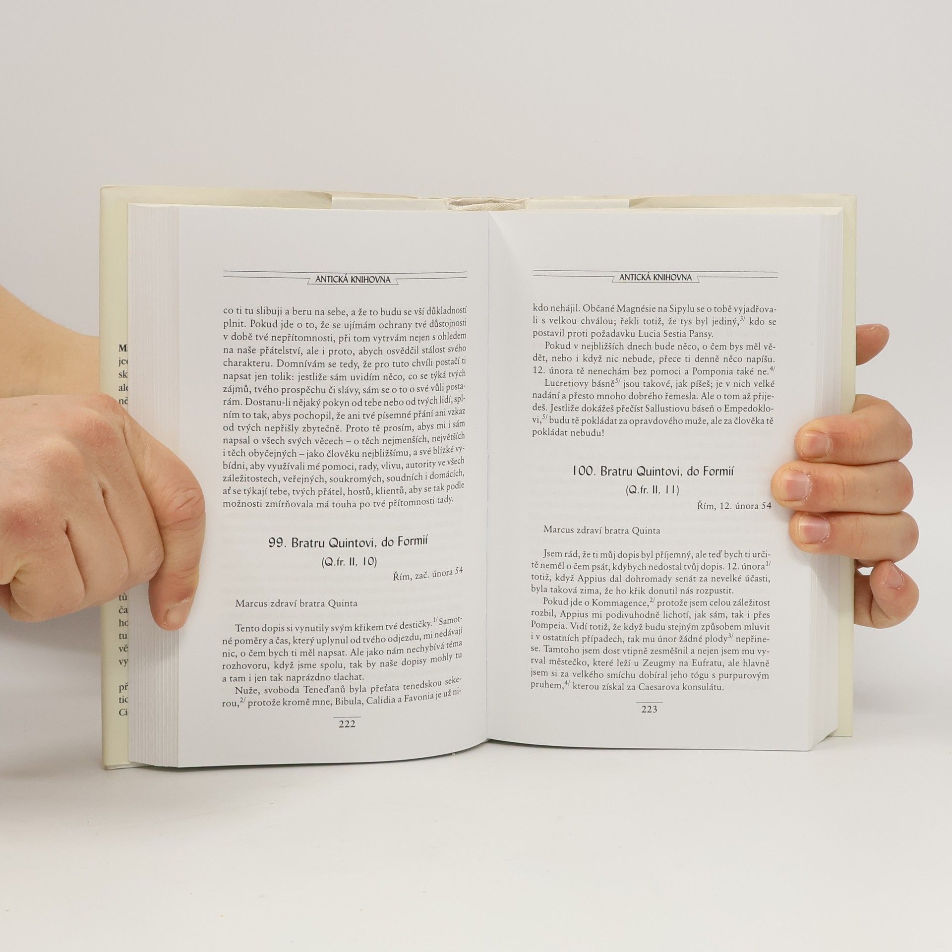Z původního nesčíslného množství Ciceronových dopisů se v úplnosti dochovalo 864 listů, které jsou rozděleny podle adresátů do 4 sbírek: Listy přátelům, Listy Attikovi, Listy bratru Quintovi a Listy M. Brutovi. Znalec a zasvěcený interpret Ciceronova díla, doc. PhDr. Václav Marek, Csc z Filozofické fakulty Univerzity Karlovy, připravil pro Antickou knihovnu dvousvazkový výbor nejvýznamnějších a nejzajímavějších dopisů, které uspořádal v časovém sledu jejich vzniku. První svazek obsahuje listy z let 68 – 50 a zachycuje etapu Ciceronova politického a literárního zrání.... celý text