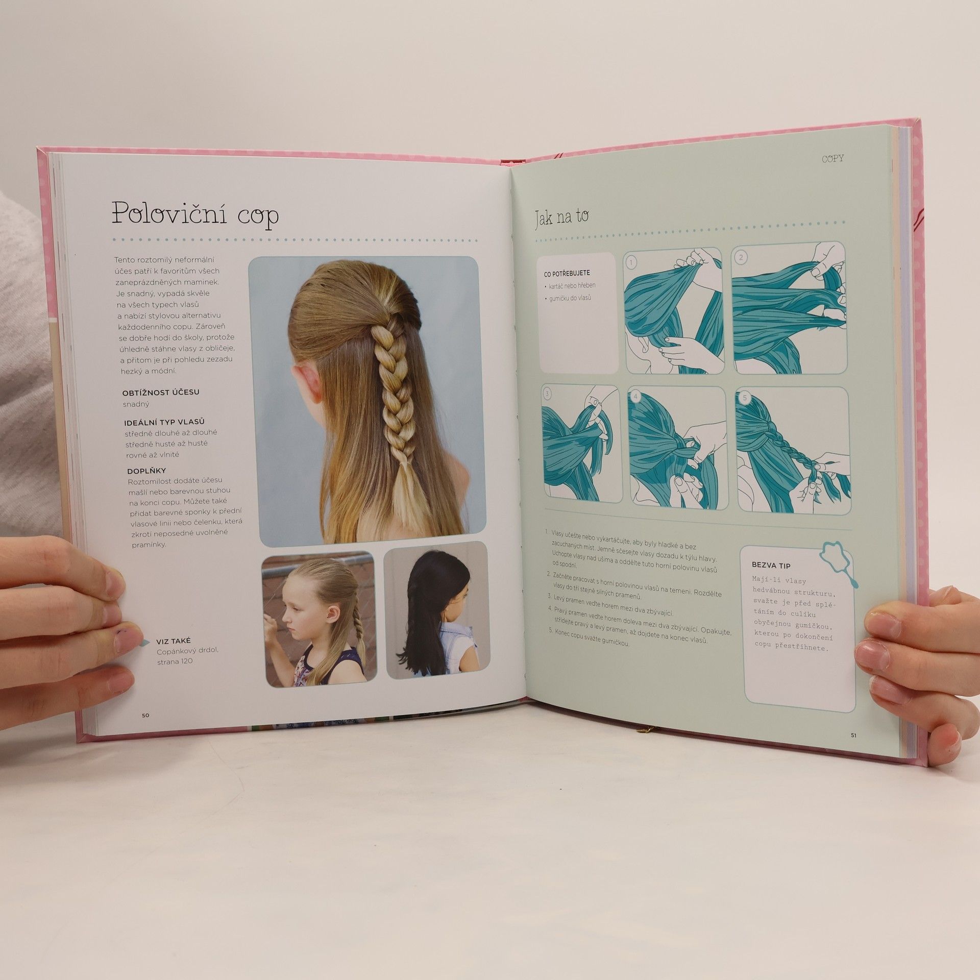 Copy, copánky, drdoly - 50 jednoduchých účesů s podrobnými návody. Potřebujete, aby vaší malé slečně vydržel účes celý den, byl dostatečně šmrncovní a jeho česání vám přitom nezabralo v ranním spěchu příliš času? Pak je tahle knížka ideální právě pro vás! Najdete tu padesát podrobně popsaných a ilustrovaných návodů na jednoduché dívčí účesy pro všední den i zvláštní příležitosti. Nechybí rady, jak pečovat o dětské vlásky a samozřejmě popis pomůcek, které budete při vytváření účesů potřebovat.