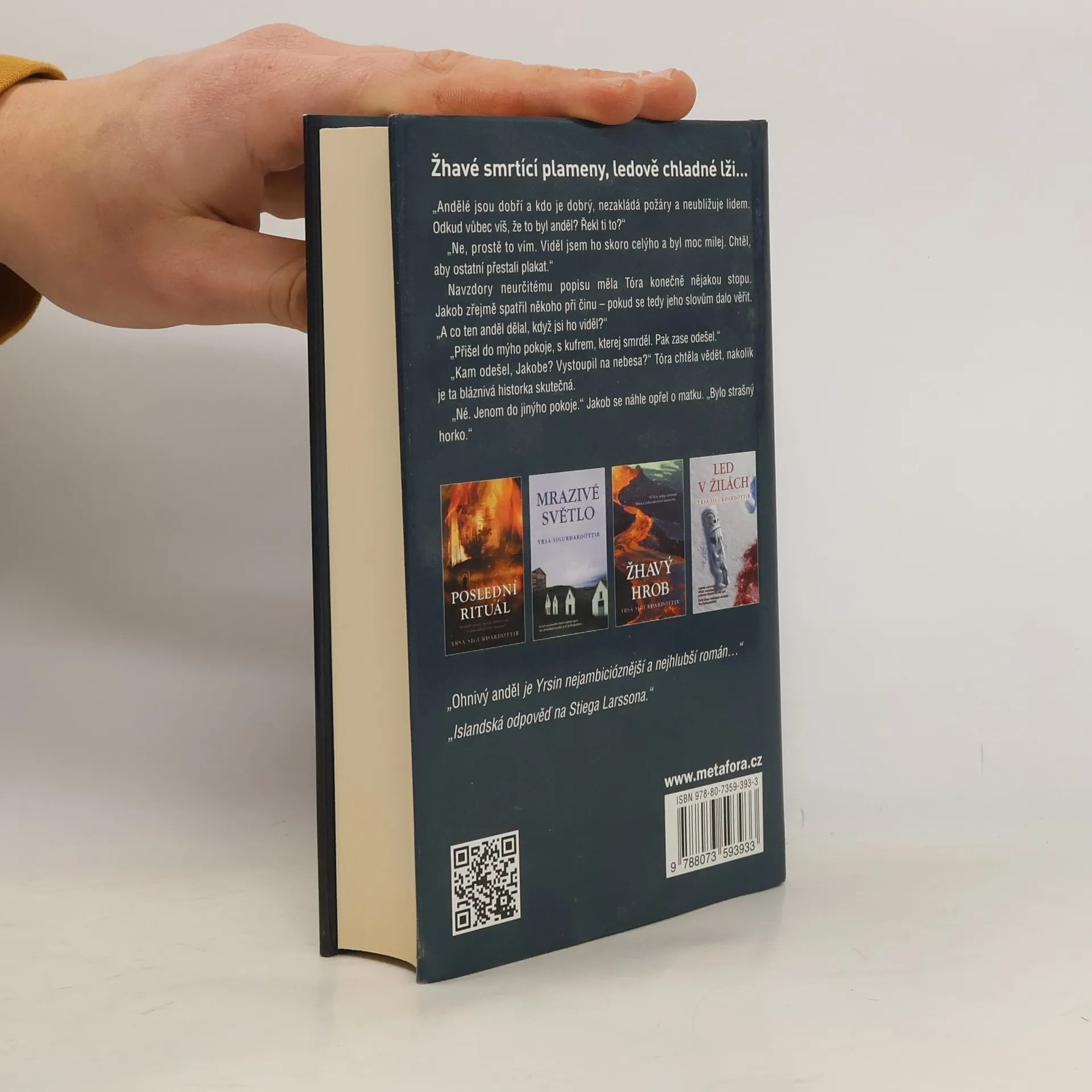 Jaké hrůzy se děly za zdmi ústavu pro postižené, který lehl popelem? Nejlepší příběh od dob Přeletu na kukaččím hnízdem Islandská odpověď na Stiega Larssona! Detektivní thriller charakterizovaný slovy „žhavé smrtící plameny, ledově chladné lži“ je mrazivý i podmanivý jako sám Island, kde talentovaná autorka žije. Advokátka Tóra Gudmundsdóttir má toho nejděsivějšího klienta své kariéry. O její služby se zajímá duševně narušený sexuální deviant ve výkonu trestu. Nežádá však osvobození pro sebe. Přeje si propuštění Jakoba, mladíka s Downovým syndromem, který údajně založil požár v ústavu pro nemocné. Brzy nato začne Tóra dostávat prazvláštní esemesky a kdekdo jako by najednou měl co skrývat. Pitva ochrnuté neslyšící dívky pak přinese úděsné odhalení… Tóra si náhle připadá jako ve zlém snu. Vždyť, kde jinde než v nočních můrách píší neviditelné ruce na zamrzlé sklo divné znaky a kde se mrtvé au-pair dožadují, že budou dál hlídat své malé svěřence?