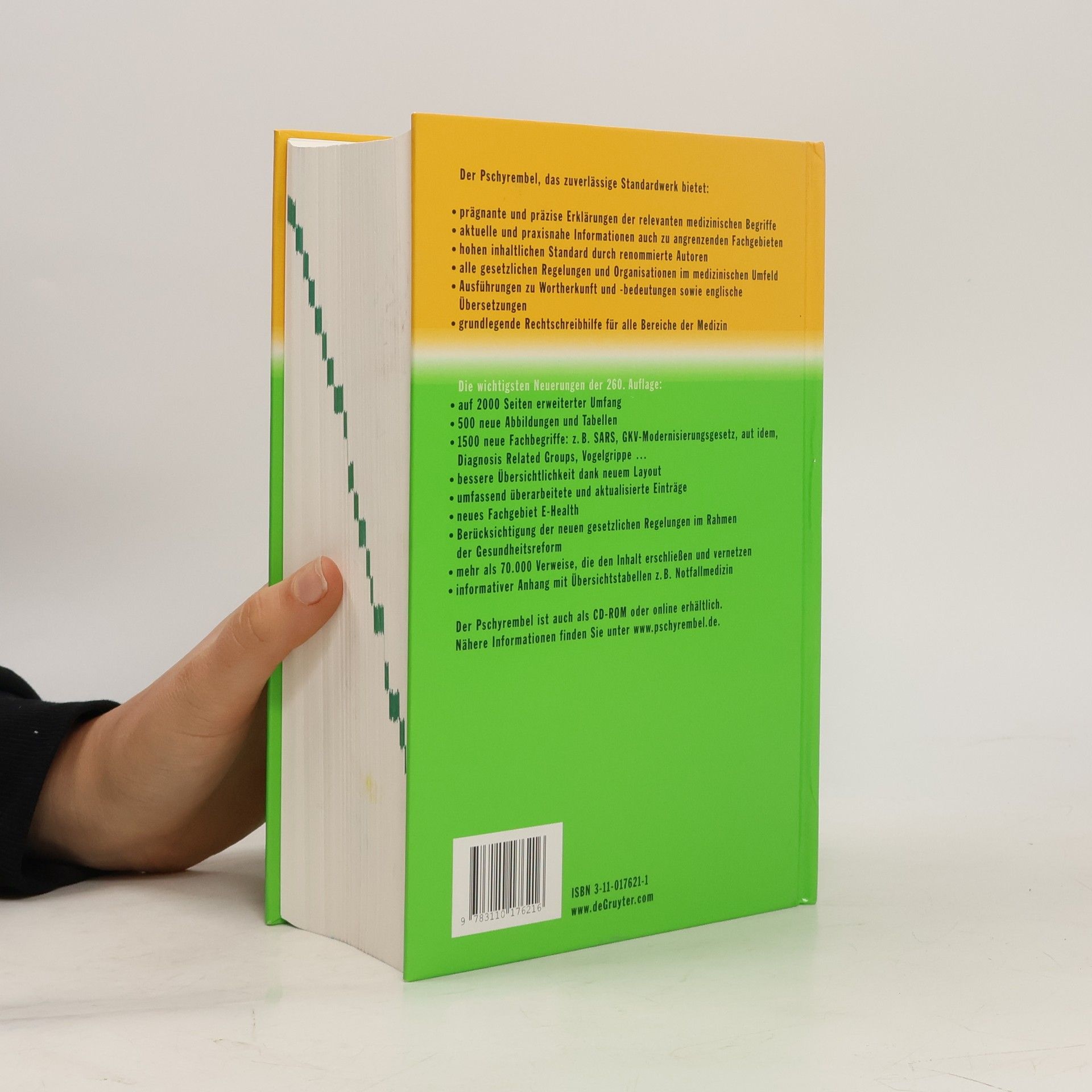 Mit seinen 260 Auflagen steht Pschyrembel® für lexikalische Kompetenz und für zuverlässig gesichertes Fachwissen. Mehr als hundert renommierte Autoren aus der medizinischen Wissenschaft und Praxis halten unser erfahrenes Redaktionsteam mit aktuellen Fachinformationen auf dem neuesten Stand. Die wichtigsten Neuerungen: Auf 2000 Seiten erweiterter Umfang Klarer Aufbau und bessere Übersichtlichkeit dank neuem Layout Überarbeitete und aktualisierte Einträge in vielen Fachbereichen Mehr als 1000 neue Fachbegriffe: SARS, Vogelgrippe, Gesundheitssystem-Modernisierungsgesetz, aut idem, DRGs Neue gesetzliche Regelungen im Rahmen der Gesundheitsreform Etwa 70.000 Querverweise innerhalb des Werkes Rund 400 neu aufgenommene Abbildungen und Tabellen