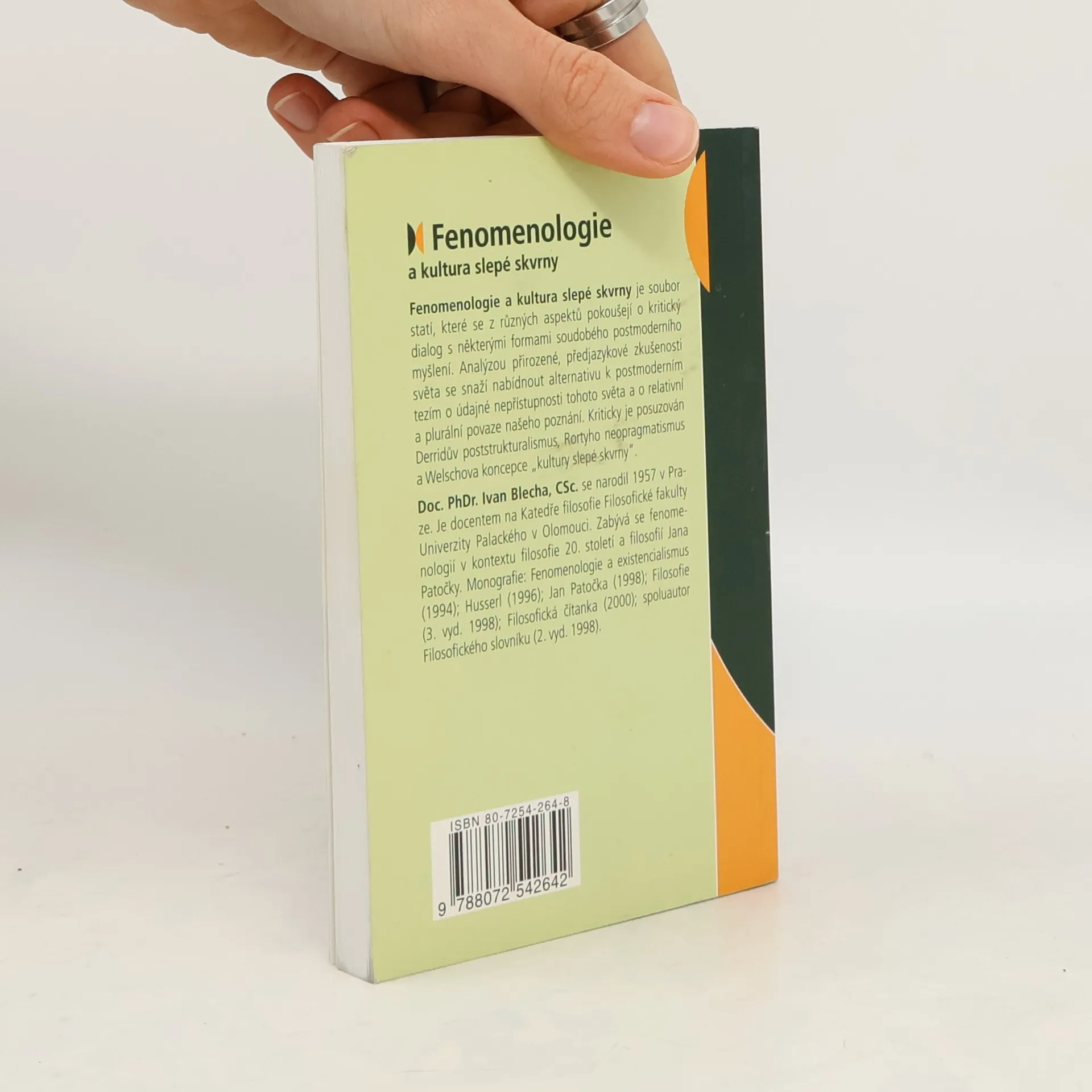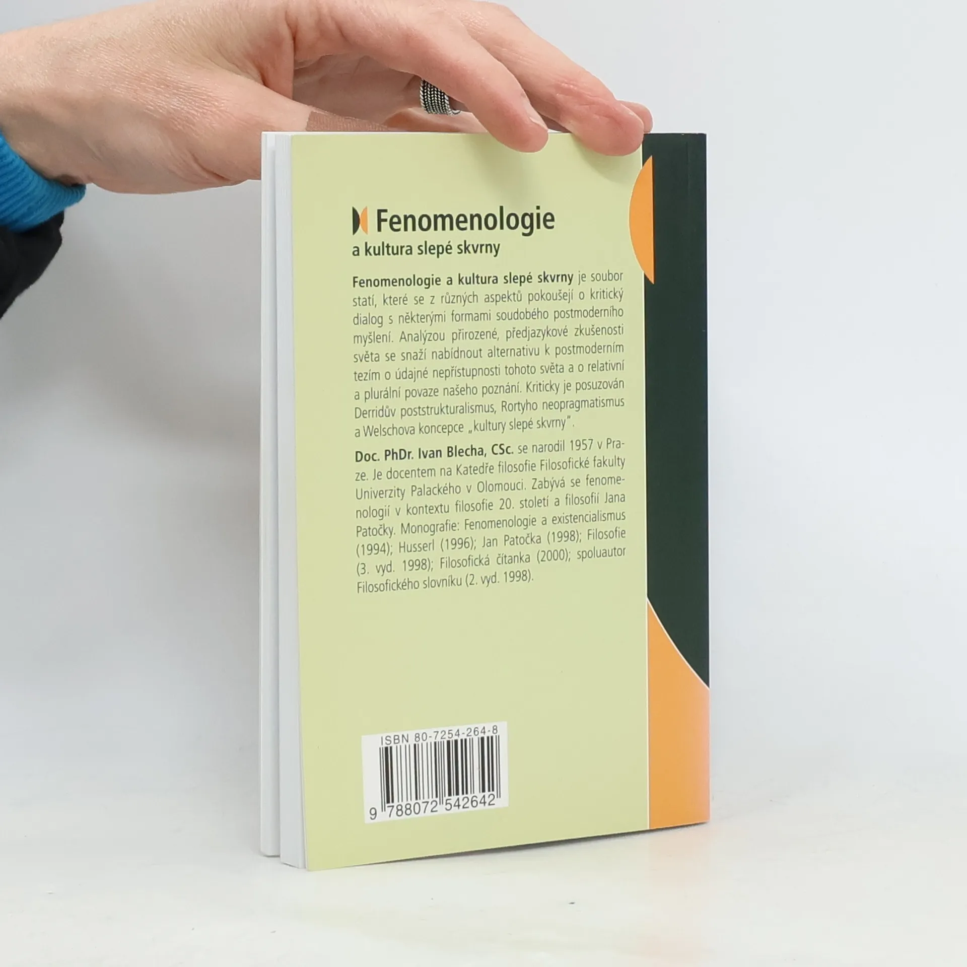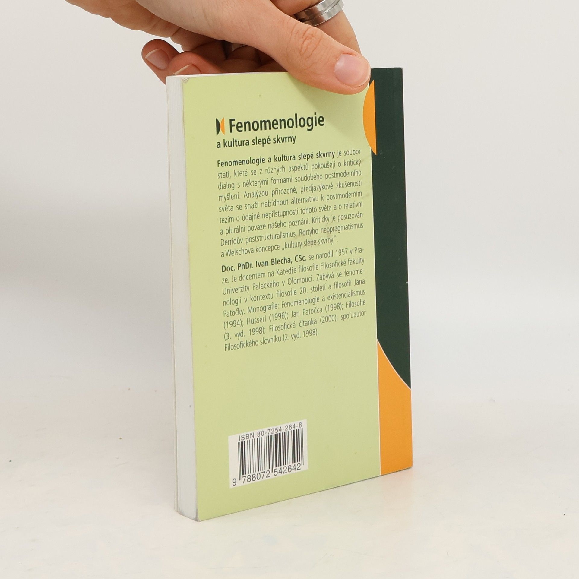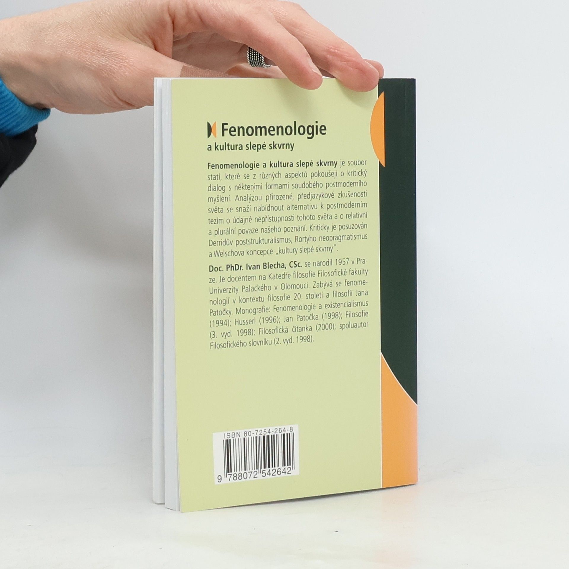 Fenomenologie a kultura slepé skvrny je soubor statí, které se z různých aspektů pokoušejí o kritický dialog s některými formami soudobého postmoderního myšlení. Analýzou přirozené, předjazykové zkušenosti světa se snaží nabídnout alternativu k postmoderním tezím o údajné nepřístupnosti tohoto světa a o relativní a plurální povaze našeho poznání. Kriticky je posuzován Derridův poststrukturalismus, Rortyho neopragmatismus a Welschova koncepce „kultury slepé skvrny“. Doc. PhDr. Ivan Blecha, CSc. je docentem na Katedře filosofie Filosofické fakulty Univerzity Palackého v Olomouci. Zabývá se fenomenologií v kontextu filosofie 20. století a filosofií Jana Patočky.