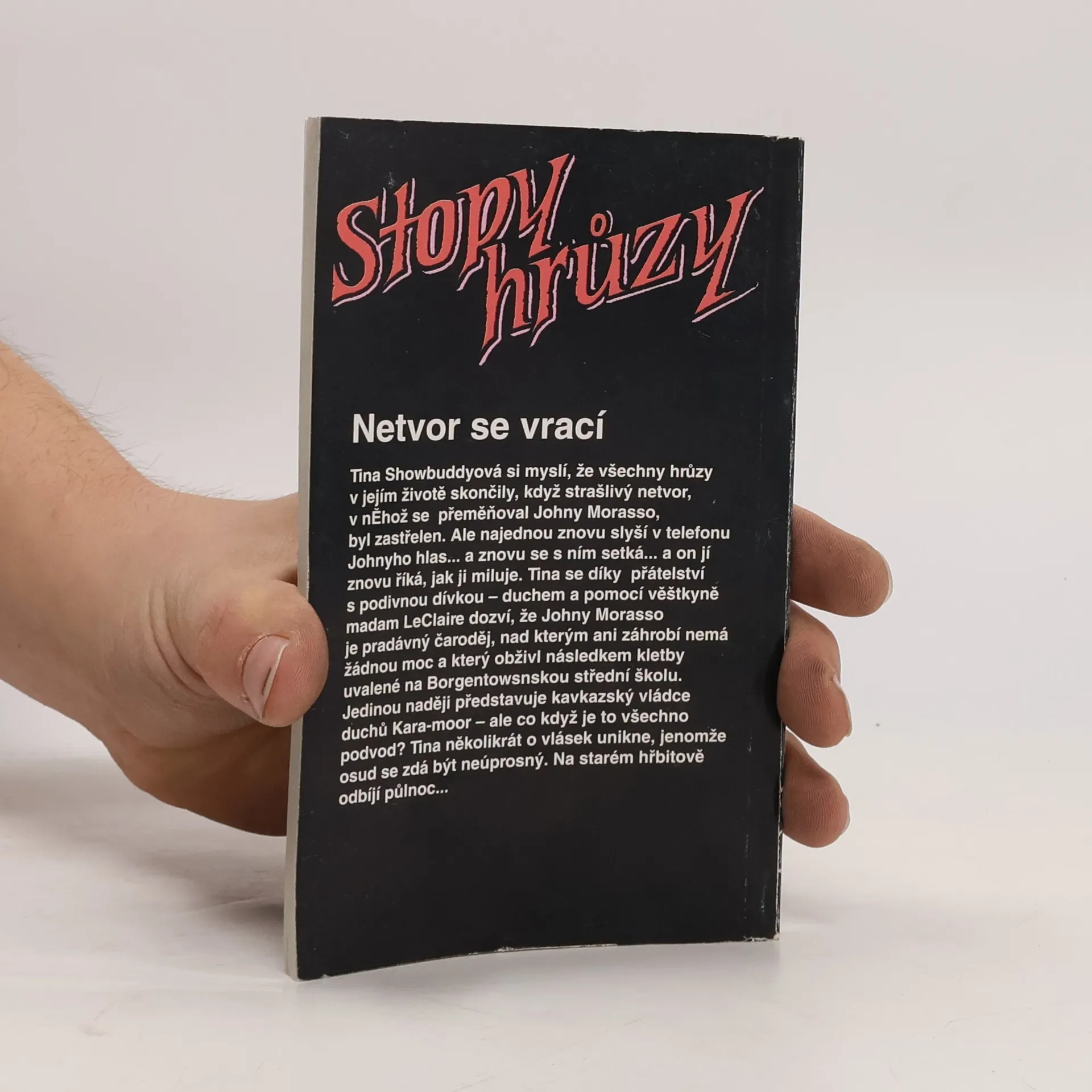 Tina Showbuddyová si myslí, že všechny hrůzy v jejím životě skončily, když strašlivý netvor, v něhož se přeměňoval Johny Morasso, byl zastřelen. Ale najednou znovu slyší v telefonu Johnyho hlas… a znovu se s ním setká… a on jí znovu říká, jak jí miluje. Tina se díky přátelství s podivnou dívkou – duchem a pomocí věštkyně madame LeClaire dozví, že Johny Morasso je pradávný čaroděj, nad kterým ani záhrobí nemá žádnou moc a který obživl následkem kletby uvalené na Borgentownskou střední školu. Jedinou naději představuje kavkazský vládce duchů Kara-moor – ale co když je to všechno podvod? Tina několikrát o vlásek unikne, jenomže osud se zdá být neúprosný. Na starém hřbitově odbíjí půlnoc…