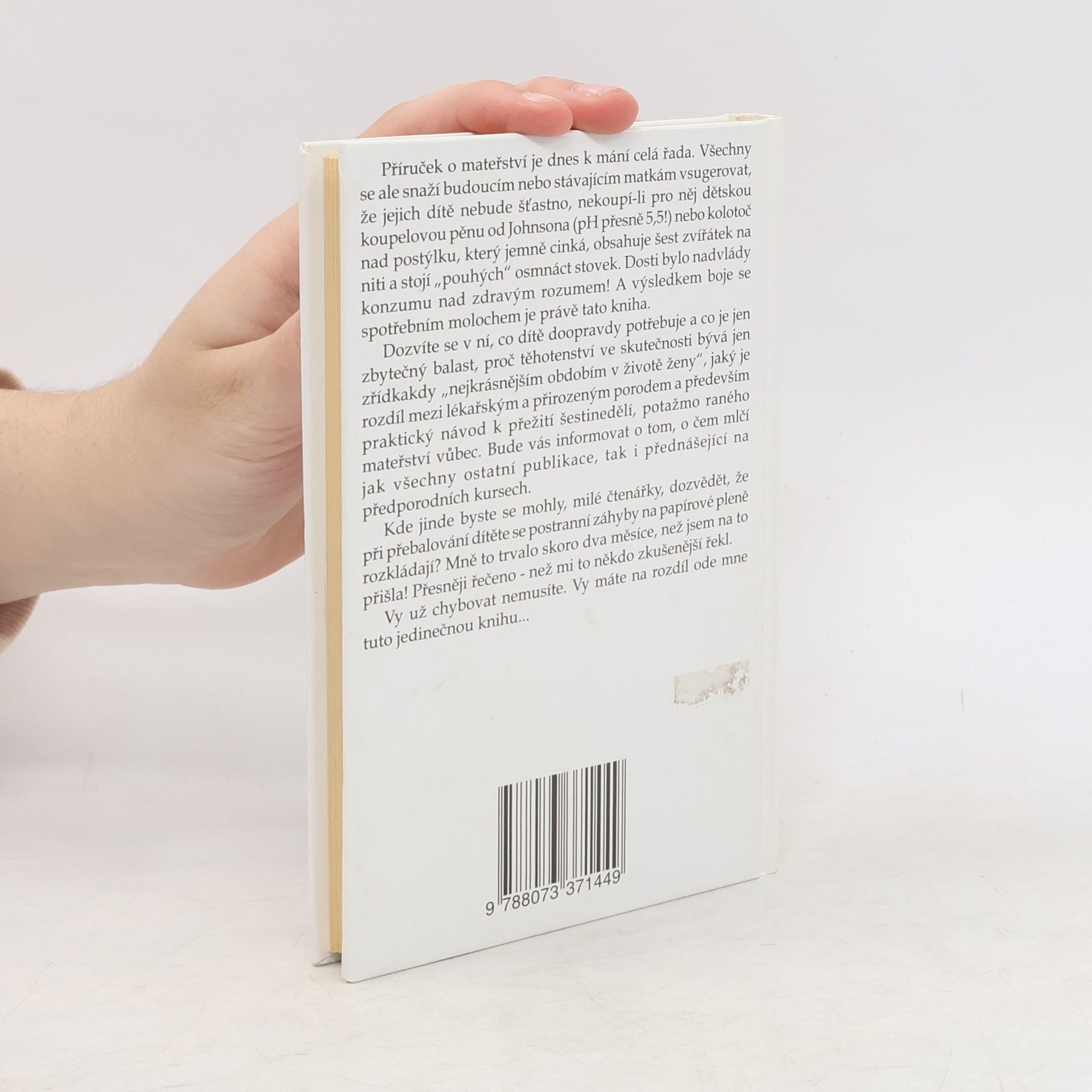 Příruček o mateřství je dnes k mání celá řada, v této publikaci se však dozvíte, co DOOPRAVDY VAŠE DÍTÉ potřebuje a co je jen zbytečný balast. Proč těhotenství ve skutečnosti bývá jen zříkakdy "nejkrásnějším obdobím v životě ženy ". Bude Vás informovat o tom, o čem mlčí jak všechny ostatní publikace, tak i přednášející na předporodních kursech.