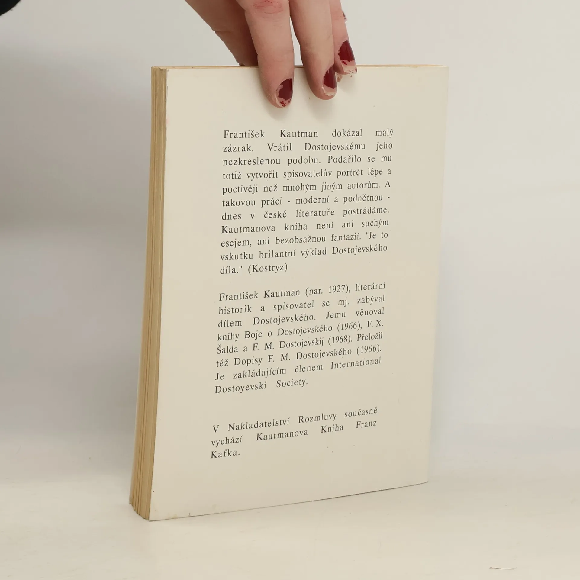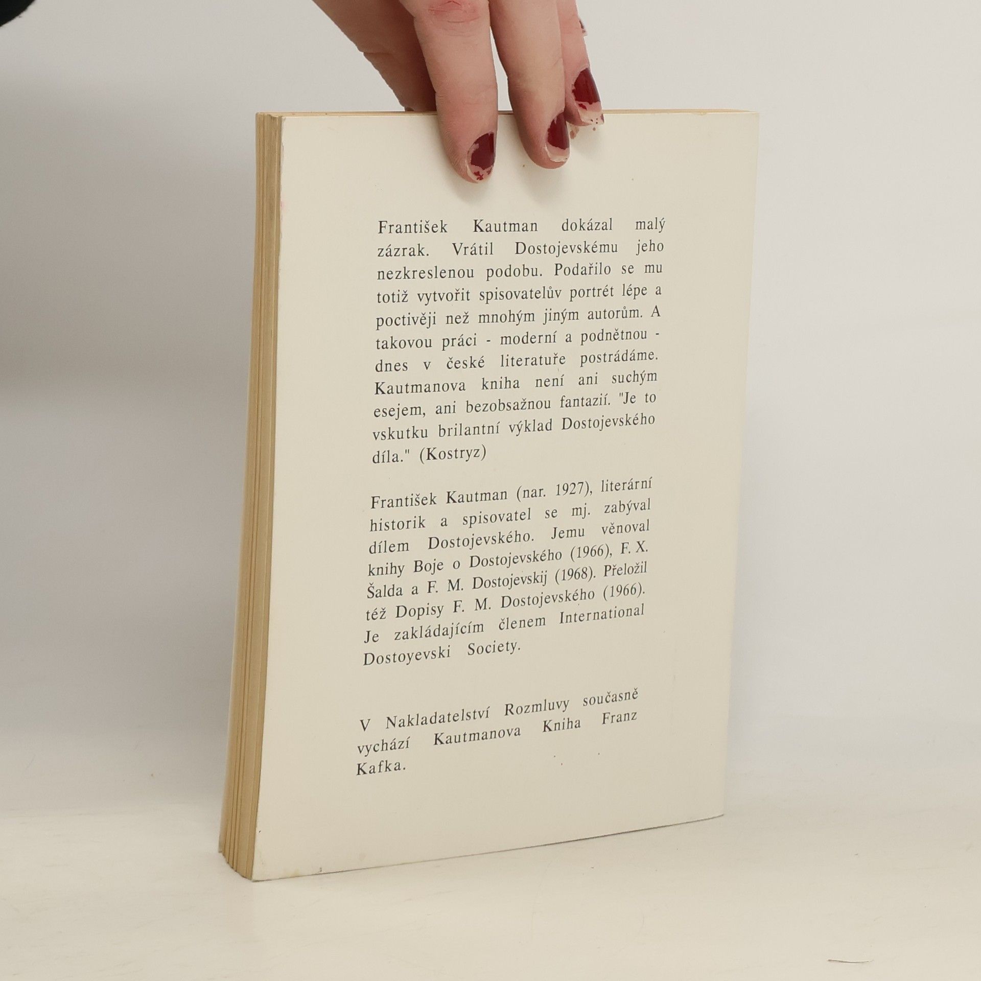 Osoba a dílo F. M. Dostojevského vzbuzuje stále mnoho otázek a nejasností. František Kautman dokázal vrátit Dostojevskému jeho nezkreslenou podobu. Podařilo se mu totiž vytvořit spisovatelův portrét lépe a poctivěji než jiným autorům. Kautmanova kniha není jen suchým esejem ani bezobsažnou fantazií. Je to vskutku brilantní výklad Dostojevského díla, jak se o rukopisu knihy vyjádřil Josef Kostohryz.... celý text