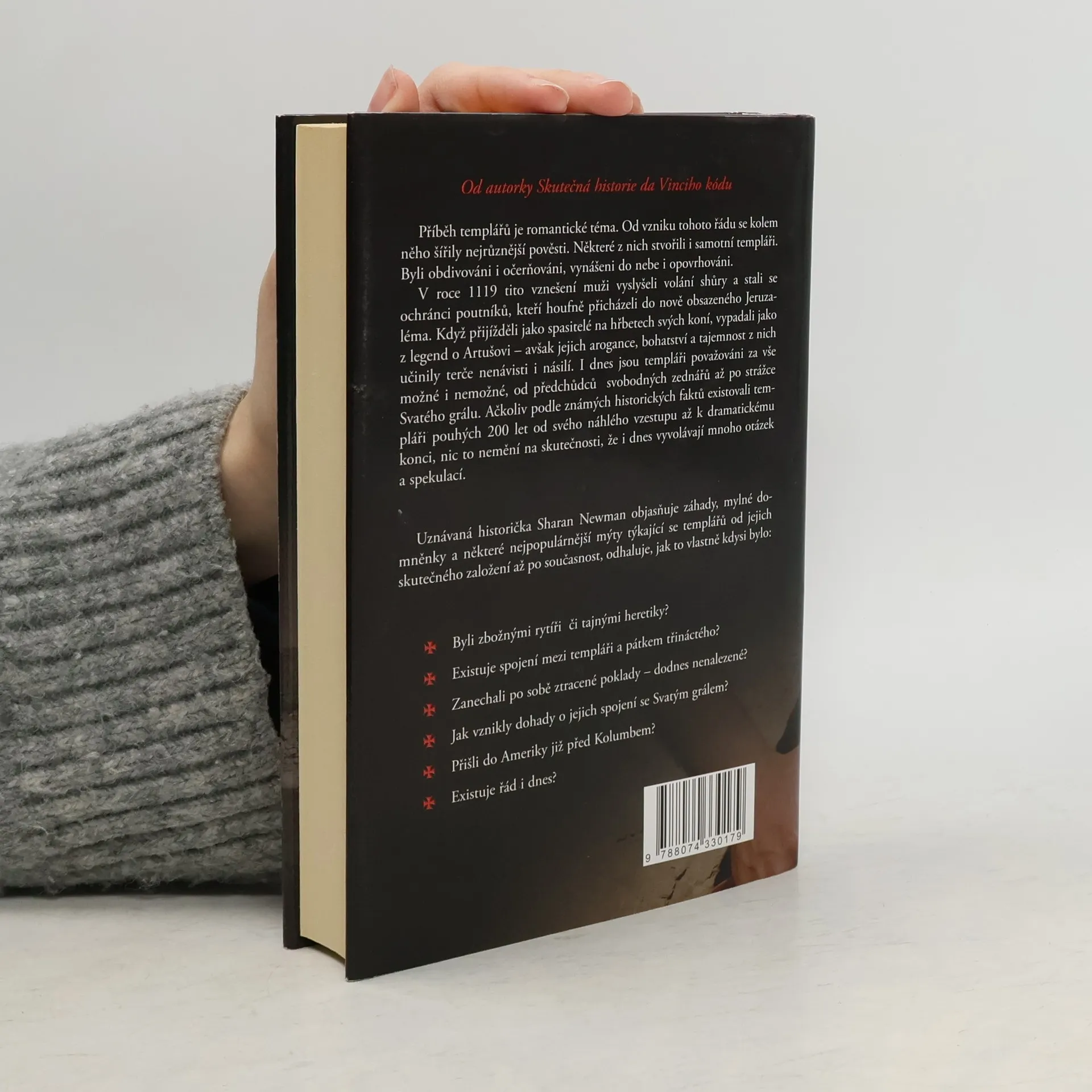 Podtitul: Od Indiana Jonese k šifře mistra Leonarda - pravda místo fikce Kniha se pokouší shromáždit historická fakta o rytířích Templu od jejich vzniku na počátku 12. století až do rozpuštění řádu v roce 1312. Zároven zmiňuje a vyvrací mýty provázející templáře až do současnosti. Uznávaná americká historička objasňuje záhady kolem řádu templářů, zpopularizované v Brownově románu Da Vinciho kód. Snaží se uvést na pravou míru fakta o templářích z období let 1119-1120, kdy řád vznikl, až do jeho rozpuštění roku 1312. Objasňuje nejpopulárnější mýty a legendy (templáři a zednáři, templáři a Rosslynská kaple, kataři, Svatý grál, cesty templářů, iniciační rituál), zmiňuje či zpochybňuje některé domněnky (pseudohistorická tvrzení a knihy), které tajemstvím obestřený řád doprovázejí až do současnosti. Snaží se na základě historických dokumentů nalézt skutečnou podobu templářů. Zmiňuje nejvýznamnější osobnosti spjaté s tímto řádem.