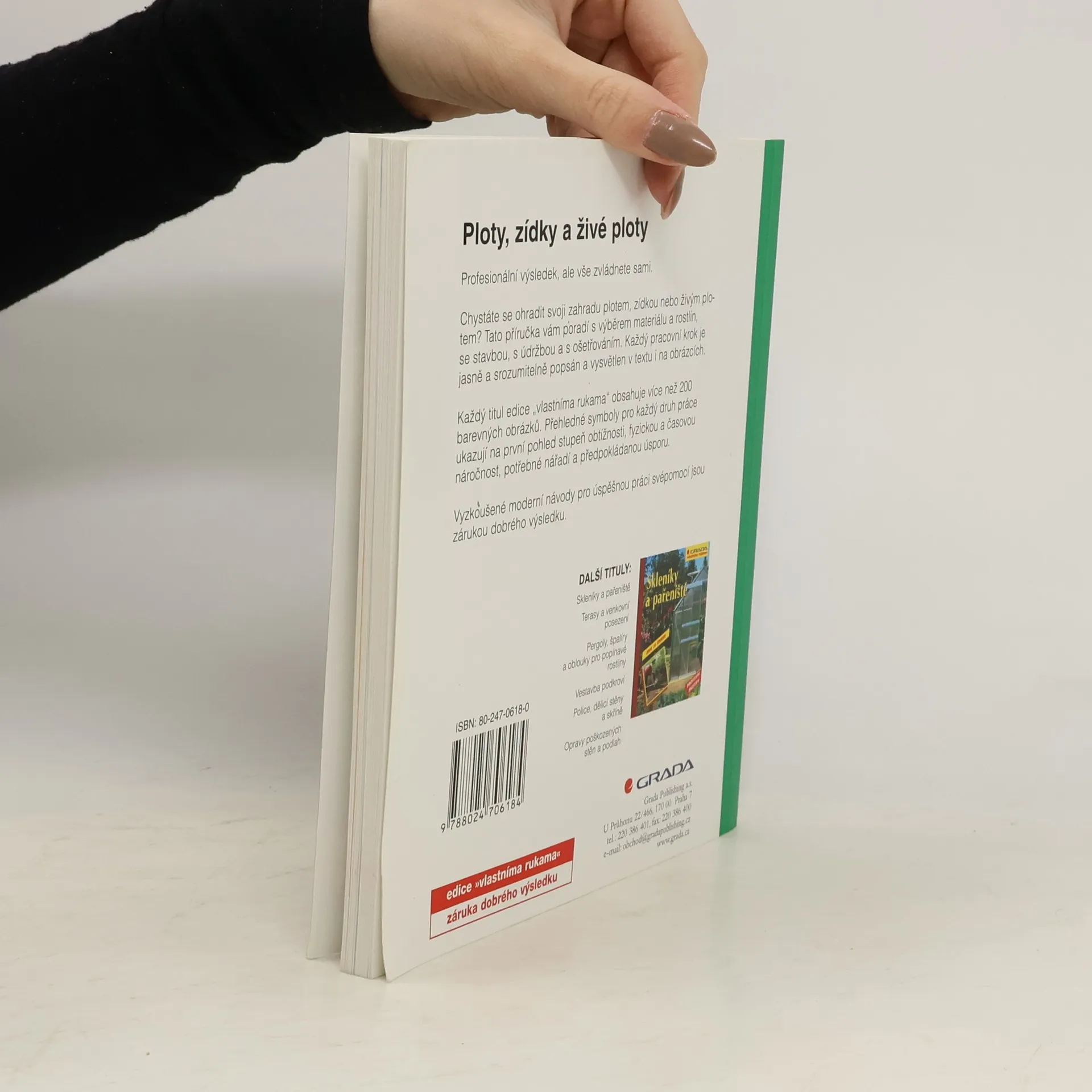 Chystáte se ohradit svoji zahradu plotem, zídkou nebo živým plotem? Tato příručka vám poradí s výběrem materiálu a rostlin, se stavbou, s údržbou a s ošetřováním. Najdete zde návody, jak si postavit kamennou zídku, rustikální ohradu, běžný plot z latí, drátěného pletiva či jak správně vybrat a zasadit dřeviny na živý plot. Každý pracovní krok je jasně a srozumitelně popsán a vysvětlen v textu i na obrázcích. Každý titul edice "vlastníma rukama" obsahuje více než 200 barevných obrázků. Přehledné symboly pro každý druh práce ukazují na první pohled stupeň obtížnosti, fyzickou a časovou náročnost, potřebné nářadí a předpokládanou úsporu.