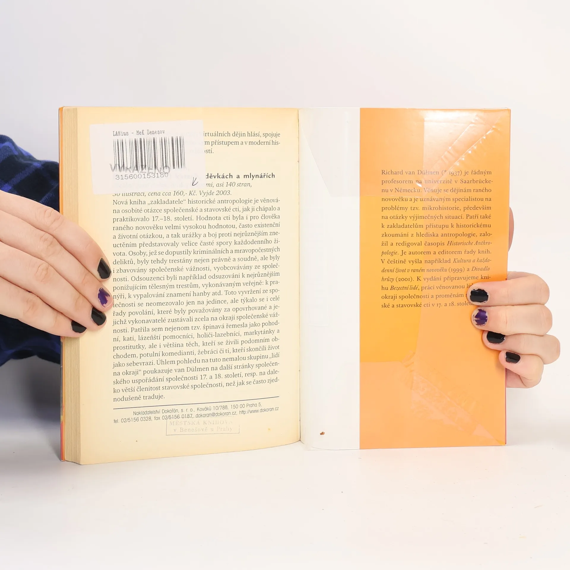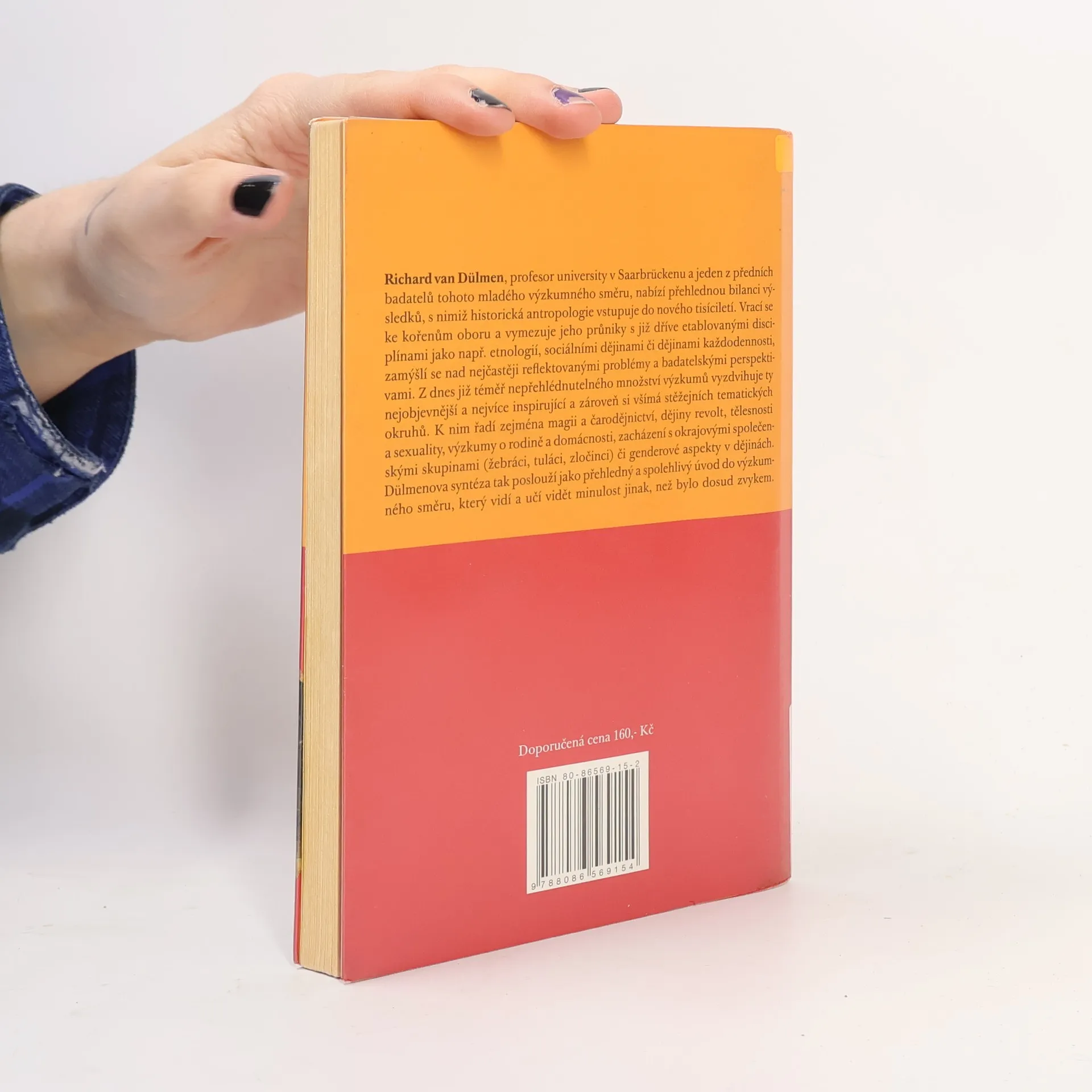 Vývoj - Problémy - Úkoly. Kniha je prvním českým titulem, který se metodicky zabývá tématem historické antropologie. Kromě přehledné definice historické antropologie a vymezení jejího vztahu k ostatním disciplínám - sociálním dějinám, etnologii, mikrohistorii atd. - přibližuje její zaměření na opomíjenou problematiku historického poznávání, zejména orientaci na člověka jako aktéra dějin, na kulturu, životní styl, úlohu subjektivní zkušenosti, význam tradic, globalizaci světa. V závěru vymezuje dosud málo rozpracovaná témata, kterým by se historická antropologie měla v budoucnu podrobněji věnovat: formy násilí, magii, čarodějnictví, lidé na okraji společnosti, proměny sexuality, gender, úloha cizinců a emigrace, paměti a osobní písemnosti, úloha médií atd. Richard van Dülmen je profesorem na univerzitě v Saarbrückenu.