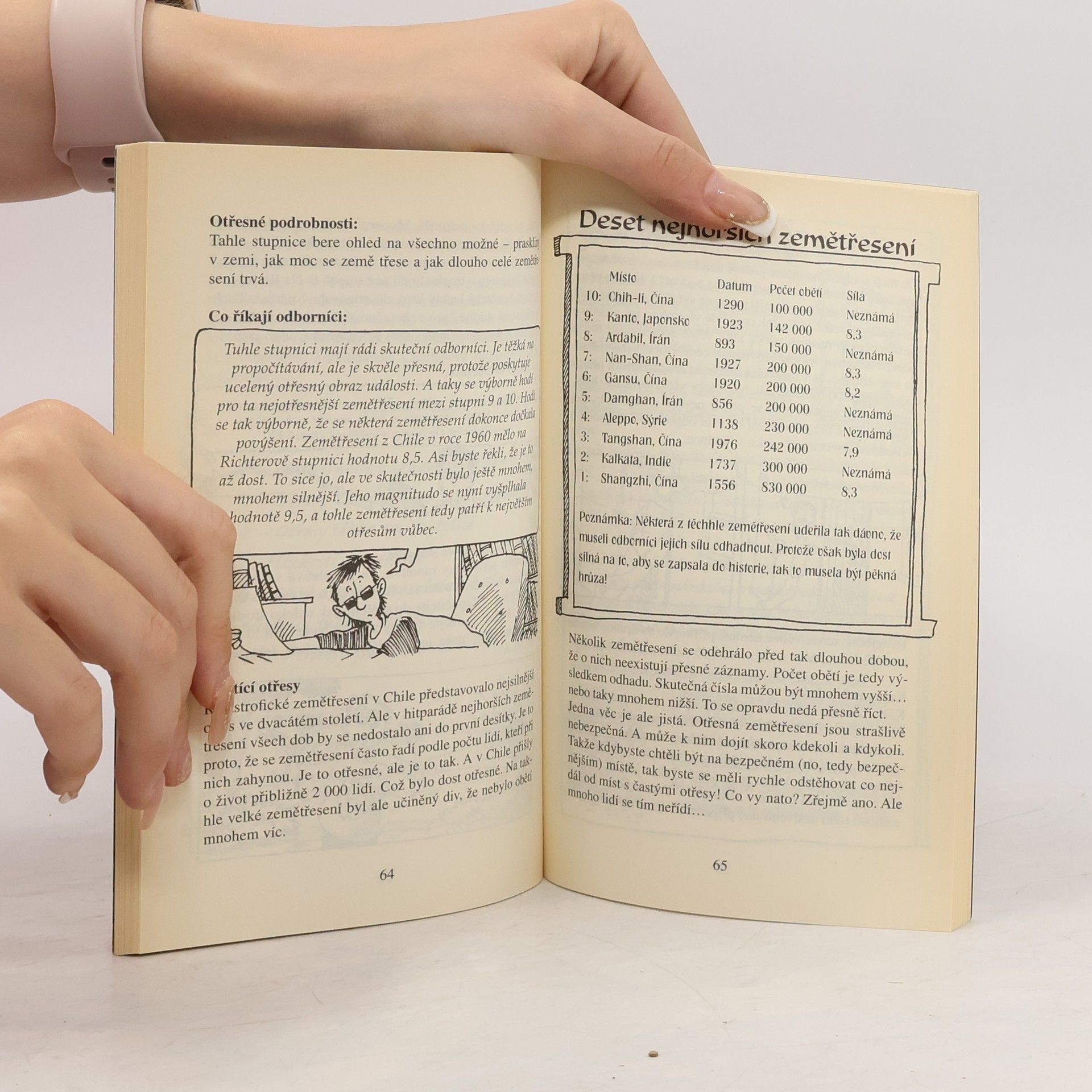 Dozvíte se například: - že zemětřesení může obrátit tok řeky, - jak vzniká obrovská vlna tsunami, - které zvířátko vypadlo při zemětřesení z klece. A jestli se vám ani tohle nezdá dost otřesné, vyzkoušejte si, zda máte na to stát odborníkem přes zemětřesení, naučte se zemětřesení přežít a ověřte si, zda krysy a hadi skutečně dokážou předvídat otřesy půdy.