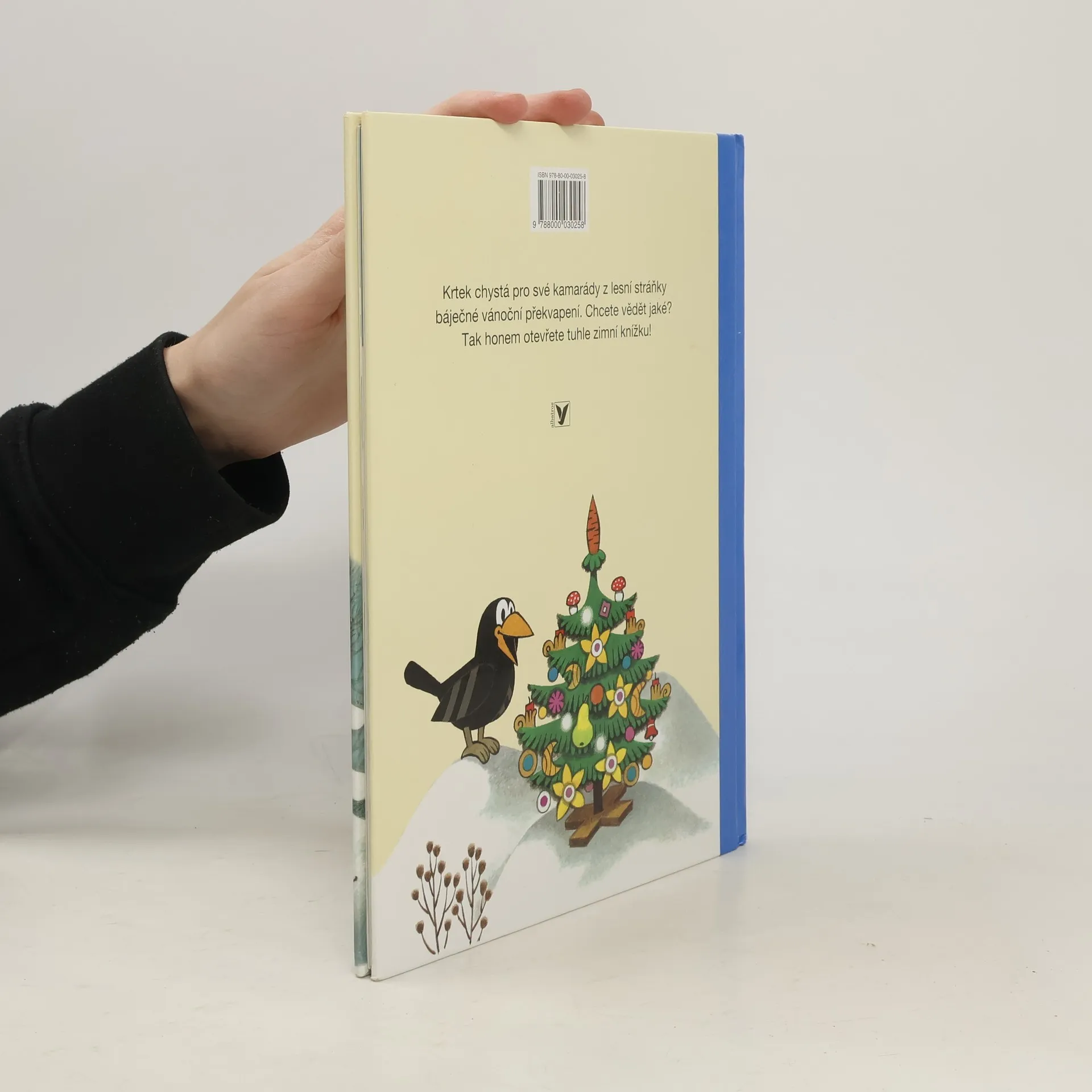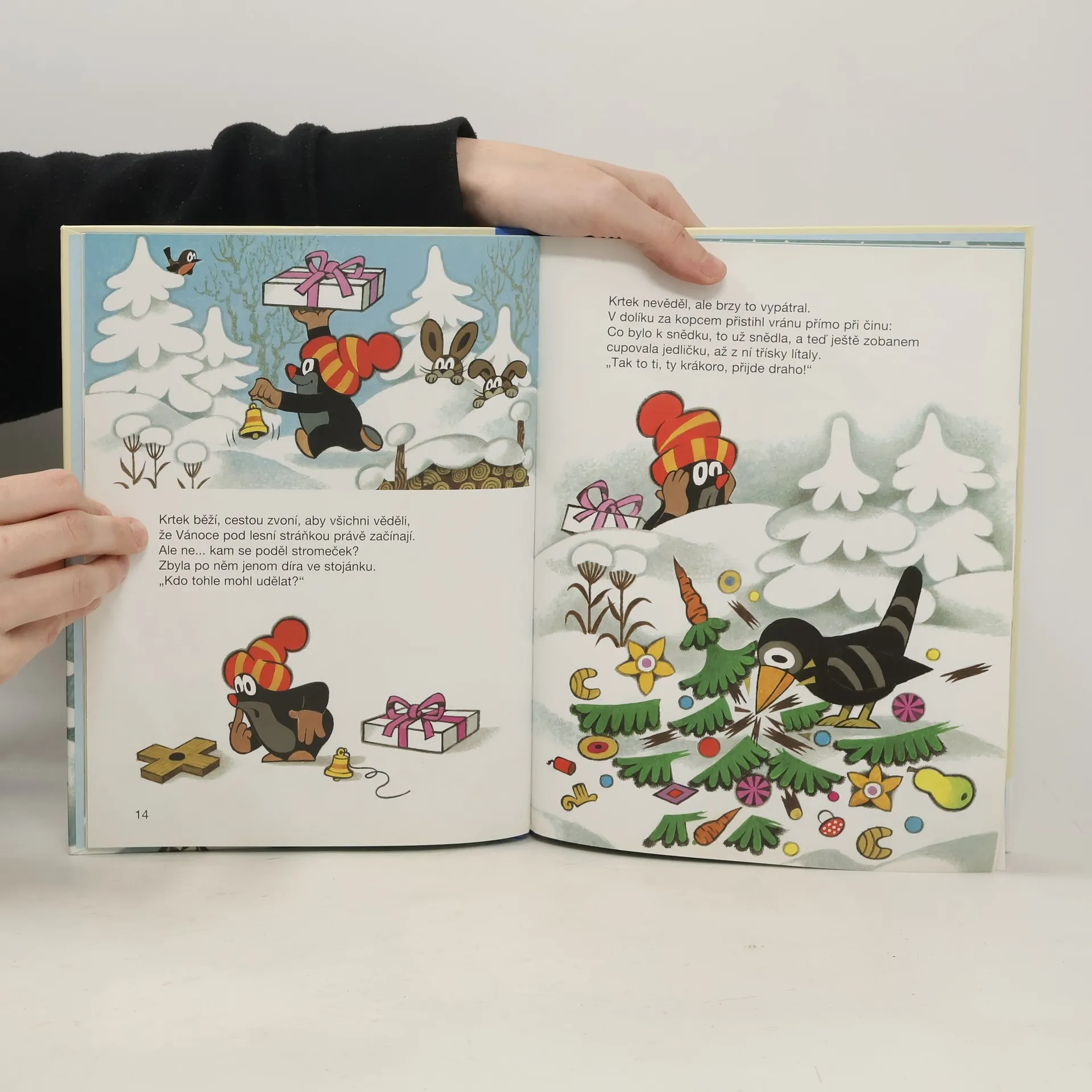 Byla zima, všude sníh, a zvířátka tvrdě spala ve svých teplých pelíšcích. Krtek nikoliv, ten běhal venku. Chtěl přichystat pro své kamarády z lesní stráňky báječné vánoční překvapení. Ukázalo se však, že to nebude tak jednoduché, jak se zpočátku zdálo. Zdálky ho totiž pozorovala škodolibá tetka vrána. Jakmile spatřila krásný vánoční stromeček ozdobený dobrotami, hned na něj dostala zálusk. Krtek si ale se známou zlodějkou snadno poradil. Chcete vědět jak? Tak honem otevřete tuhle zimní knížku!