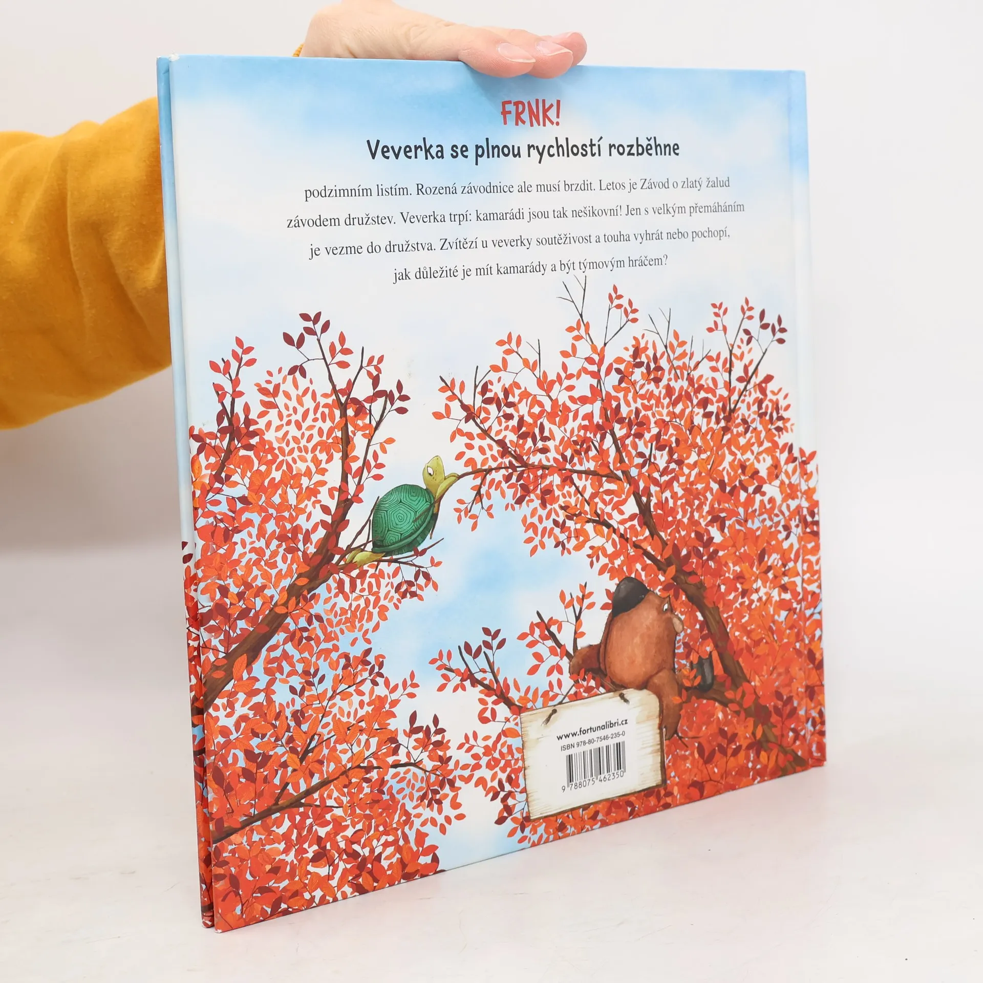 FRNK! Veverka se plnou rychlostí rozběhne podzimním listím. Rozená závodnice ale musí brzdit. Letos je Závod o zlatý žalud závodem družstev. Veverka trpí: kamarádi jsou tak nešikovní! Jen s velkým přemáháním je vezme do družstva. Zvítězí u veverky soutěživost a touha vyhrát nebo pochopí, jak důležité je mít kamarády a být týmovým hráčem?