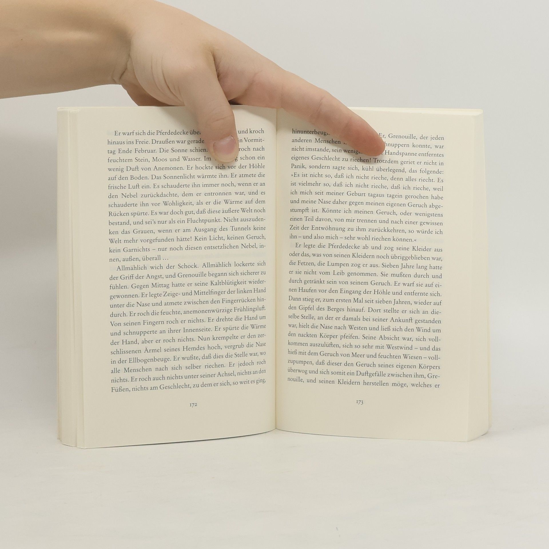 Von Jean-Baptiste Grenouille, dem finsteren Helden, sei nur verraten, daß er 1738 in Paris, in einer stinkigen Fischbude, geboren wird. Die Ammen, denen das Kerlchen an die Brust gelegt wird, halten es nur ein paar Tage mit ihm aus: Er sei zu gierig, außerdem vom Teufel besessen, wofür es untrügliche Indizien gebe: den fehlenden Duft, den unverwechselbaren Geruch, den Säuglinge auszuströmen pflegen.
