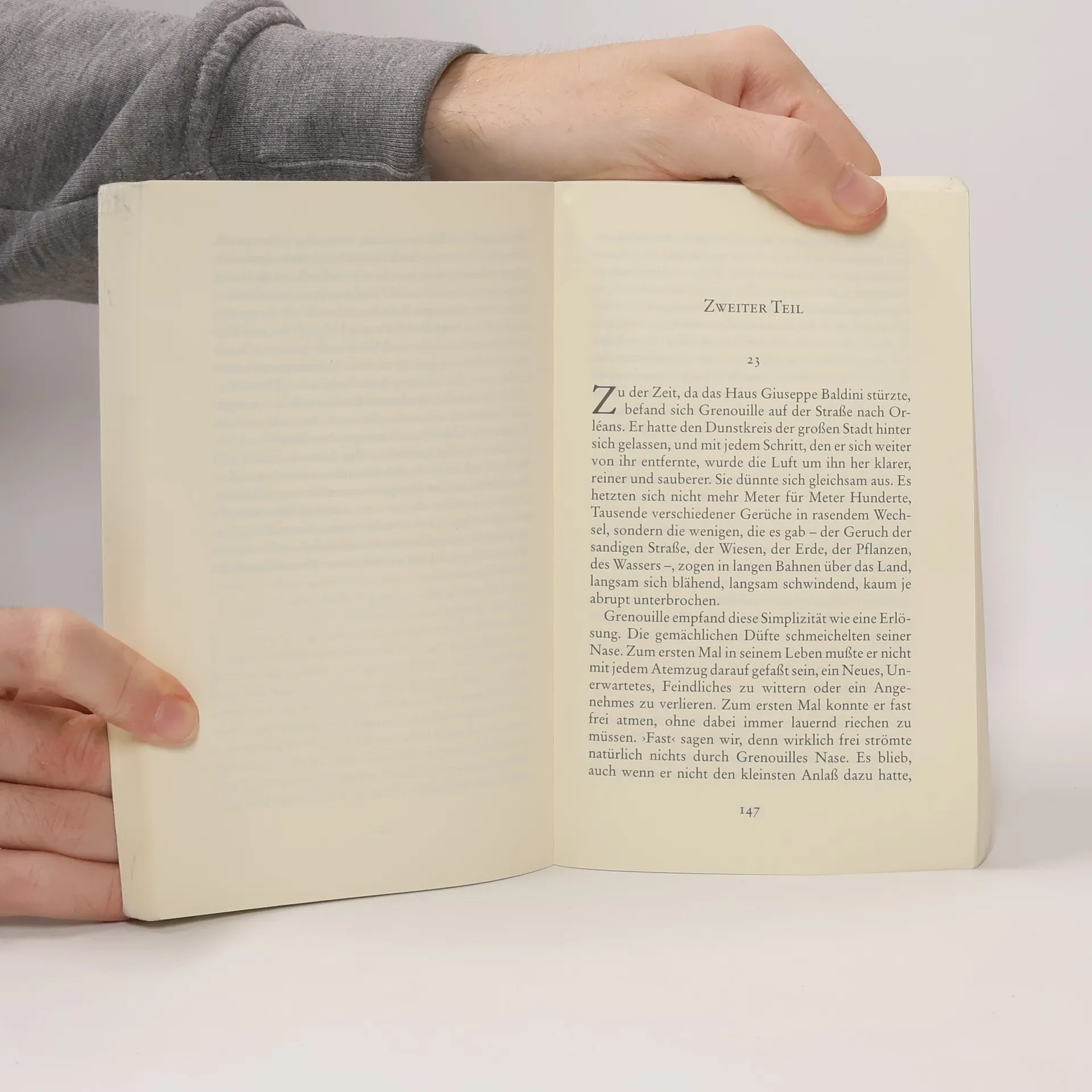Von Jean-Baptiste Grenouille, dem finsteren Helden, sei nur verraten, daß er 1738 in Paris, in einer stinkigen Fischbude, geboren wird. Die Ammen, denen das Kerlchen an die Brust gelegt wird, halten es nur ein paar Tage mit ihm aus: Er sei zu gierig, außerdem vom Teufel besessen, wofür es untrügliche Indizien gebe: den fehlenden Duft, den unverwechselbaren Geruch, den Säuglinge auszuströmen pflegen.