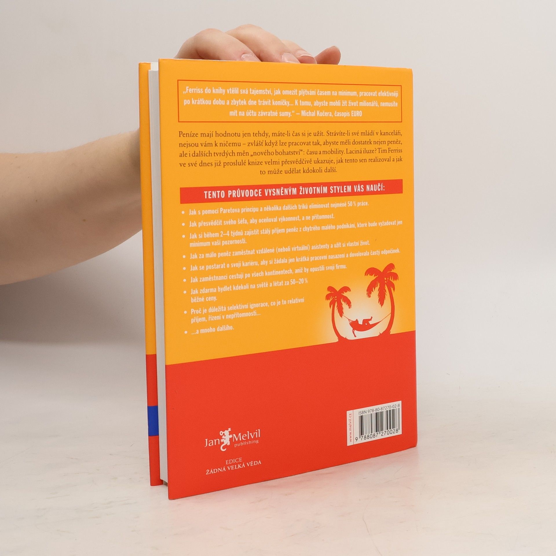 Peníze mají hodnotu jen tehdy, máte-li čas si je užít. Strávíte-li své mládí v kanceláři, nejsou vám k ničemu zvlášť když lze pracovat tak, abyste měli dostatek nejen peněz, ale i dalších tvrdých měn nového bohatství: času a mobility. Laciná iluze? Tim Ferriss ve své dnes již proslulé knize velmi přesvědčivě ukazuje, jak tento sen realizoval a jak to může udělat kdokoli další. Kniha je světovým bestsellerem a vyšla v 35 zemích.