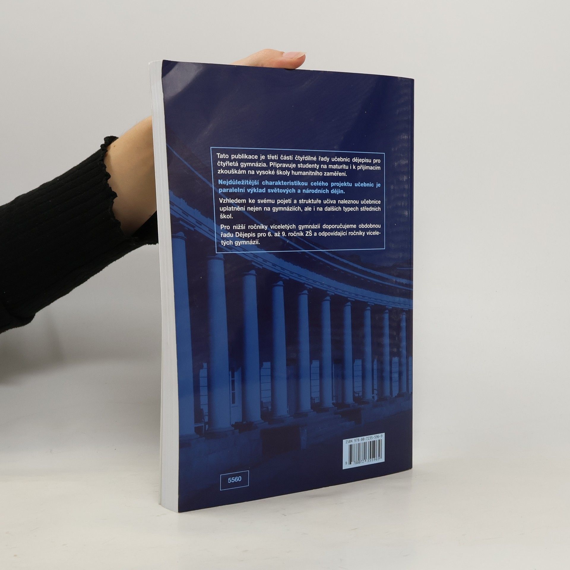Třetí z řady učebnic dějepisu pro gymnázia a střední školy – uplatní se především na gymnáziích, ale i na dalších typech škol, neboť je v učebnicích graficky odlišen základní výklad od rozšiřujícího textu. Vzhledem k rozvržení učiva s důrazem na nové dějiny umožňuje i dobrou přípravu na VŠ. Kladem řady je její nepřetíženost fakty a především paralelně vedený výklad světových i českých dějin od nejstarších dob po současnost. Učebnice obsahují bohatý obrazový materiál, početné dějepisné mapy a náležitý didaktický aparát. Přední východ ●., Egypt ●., starověké Řecko ●., starověký Řím ●., Indie ●., Čína