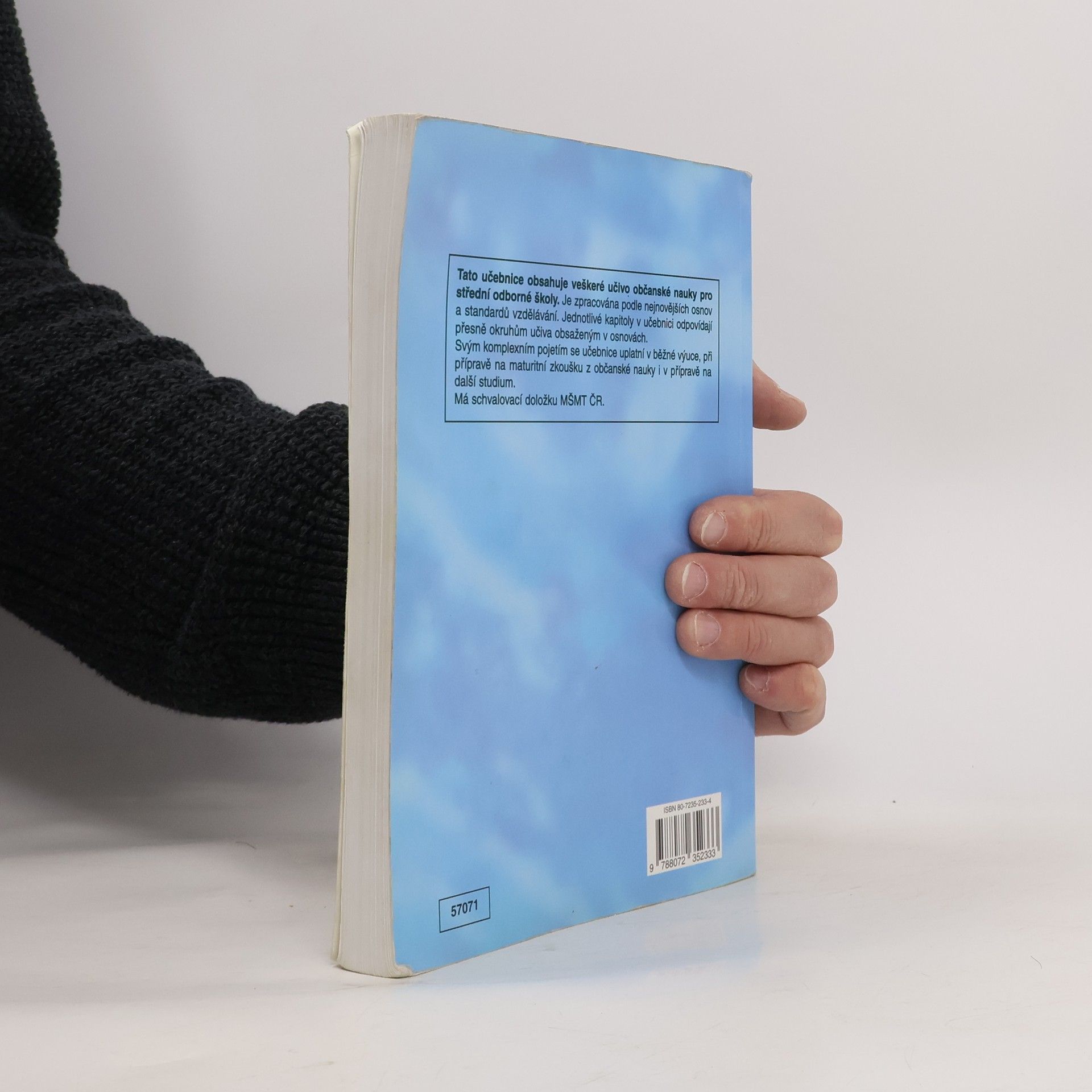 Obsahuje v jednom díle veškeré učivo předepsané nejnovějšími osnovami pro občanskou nauku SOŠ. Jednotlivé kapitoly přesně korespondují s konkrétními oddíly osnov. To umožňuje, aby jejich pořadí ve školním roce určoval učitel podle podmínek ve třídě. Obsah učiva je zpracován tradičním způsobem.