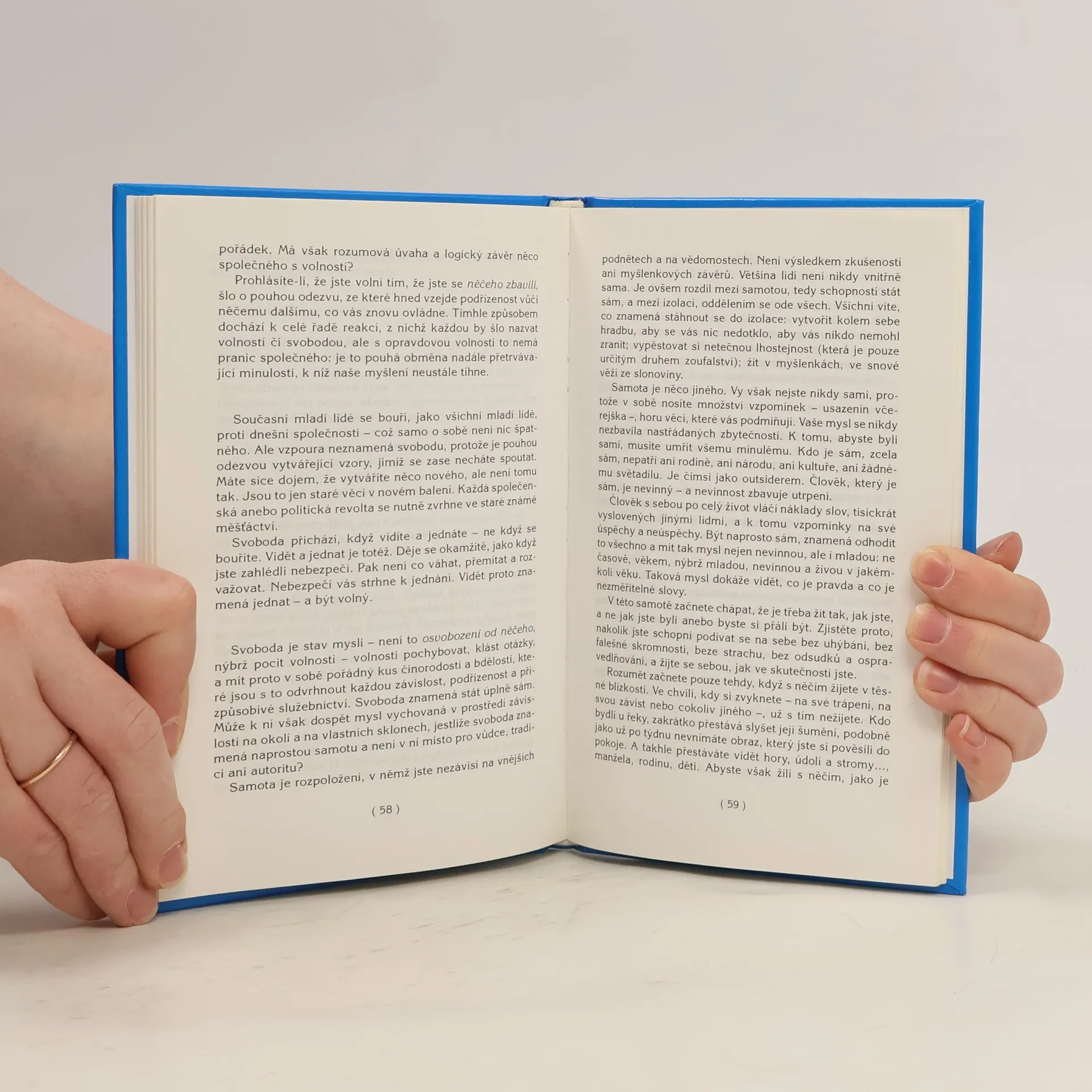 Více než půl století cestoval autor z jednoho kontinentu na druhý, přičemž na svých konferencích a přednáškách kladl jednoduché otázky a poukazoval na fakta našeho života. Ti, kdo se setkali s jeho rozpravami, byli hluboce zasaženi podmanivou atmosférou, která přitahovala tisíce lidí, včetně slavných osobností jako Aldous Huxley a Bertrand Russell. Hlavním tématem jeho diskuzí je lidská svoboda, kterou však nevnímá jako něco, co lze získat nebo přivlastnit. Krishnamurti tvrdí, že svobody nelze dosáhnout vzpourou, zápasem ani úsilím; otevírá se pouze skrze porozumění povaze naší mysli a odmítnutí všeho, co nás činí „druhorukými“ lidmi. Volnost se odhaluje jen sebepoznáním. Jeho jazyk je překvapivě prostý, nejedná se o složité filozofické úvahy, ale spíše o pozvání k přátelskému rozhovoru o povaze našeho světa. Svoboda není na konci duchovních bloudění, ale je hned na počátku a dostupná všem. Tato kniha nabízí podmanivé čtení o volnosti, která čeká na to, aby byla objevena.