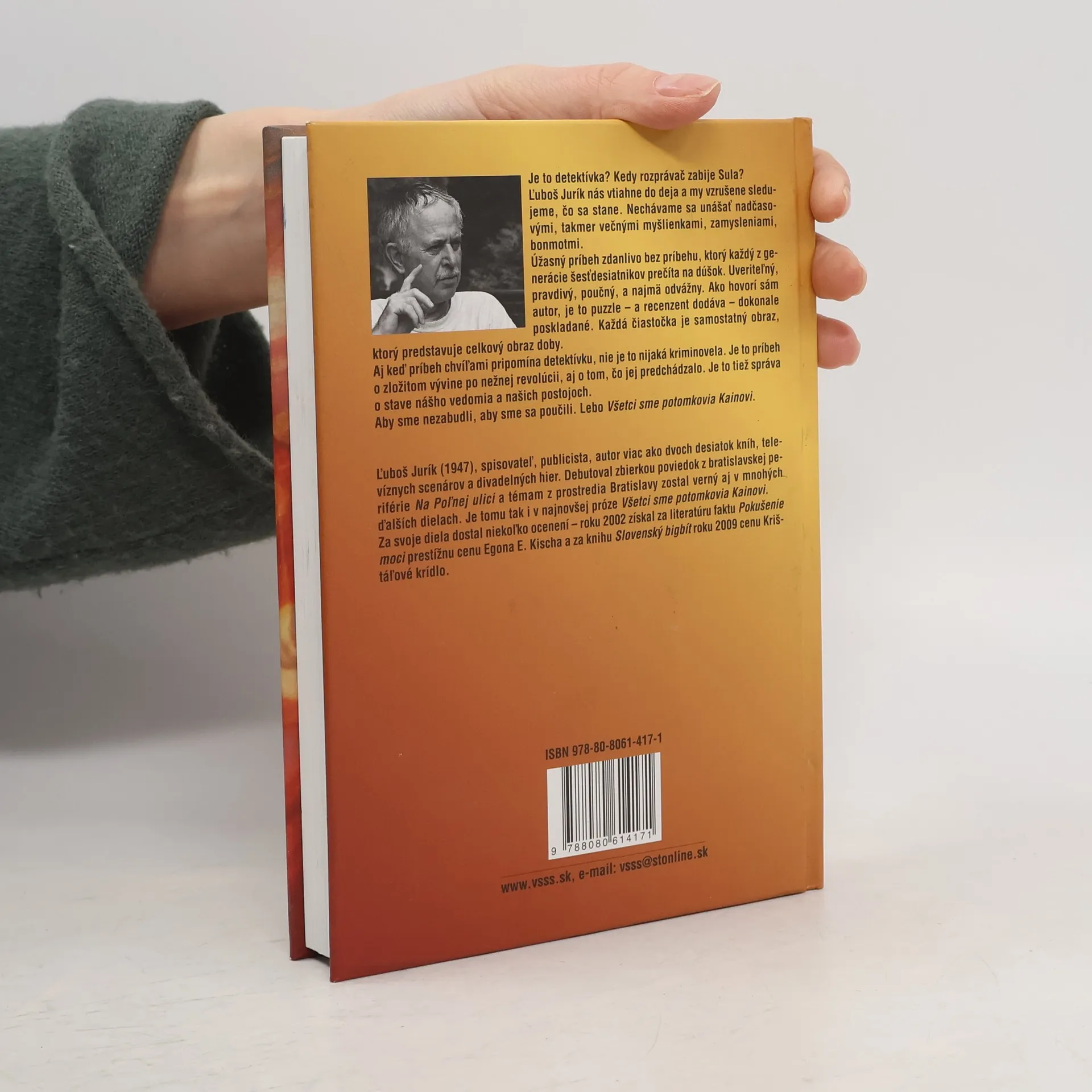 Ľuboš Jurík (1947), spisovateľ, publicista, autor viac ako dvoch desiatok kníh, televíznych scenárov a divadelných hier, nositeľ prestížnej ceny Egona E. Kischa roku 2002 za literatúru faktu Pokušenie moci a ceny Krištáľové krídlo roku 2009 za knihu Slovenská bigbít debutoval zbierkou poviedok z bratislavskej periférie Na Poľnej ulici a téme z prostredia Bratislavy zostal verný aj v najnovšej próze Všetci sme potomkovia Kainovi. Je to detektívka? Kedy rozprávač zabije Sula? Ľuboš Jurík nás vtiahne do deja a my vzrušene sledujeme, čo sa stane. Nechávame sa unášať nadčasovými, takmer večnými myšlienkami, zamysleniami, bonmotmi. Úžasný príbeh zdanlivo bez príbehu, ktorý každý z generácie šesťdesiatnikov prečíta na dúšok. Uveriteľný, pravdivý, poučný a najmä odvážny. Ako hovorí sám autor, je to puzzle - a recenzent dodáva - dokonale poskladané. Každá čiastočka je samostatný obraz, ktorý predstavuje celkový obraz doby. Aj keď príbeh chvíľami pripomína detektívku, nie je to nijaká kriminovela. Je to príbeh o zložitom vývine po nežnej revolúcii, aj o tom, čo jej predchádzalo. Je to tiež správa o stave nášho vedomia a našich postojoch. Aby sme nezabudli, aby sme sa poučili. Lebo Všetci sme potomkovia Kainovi.