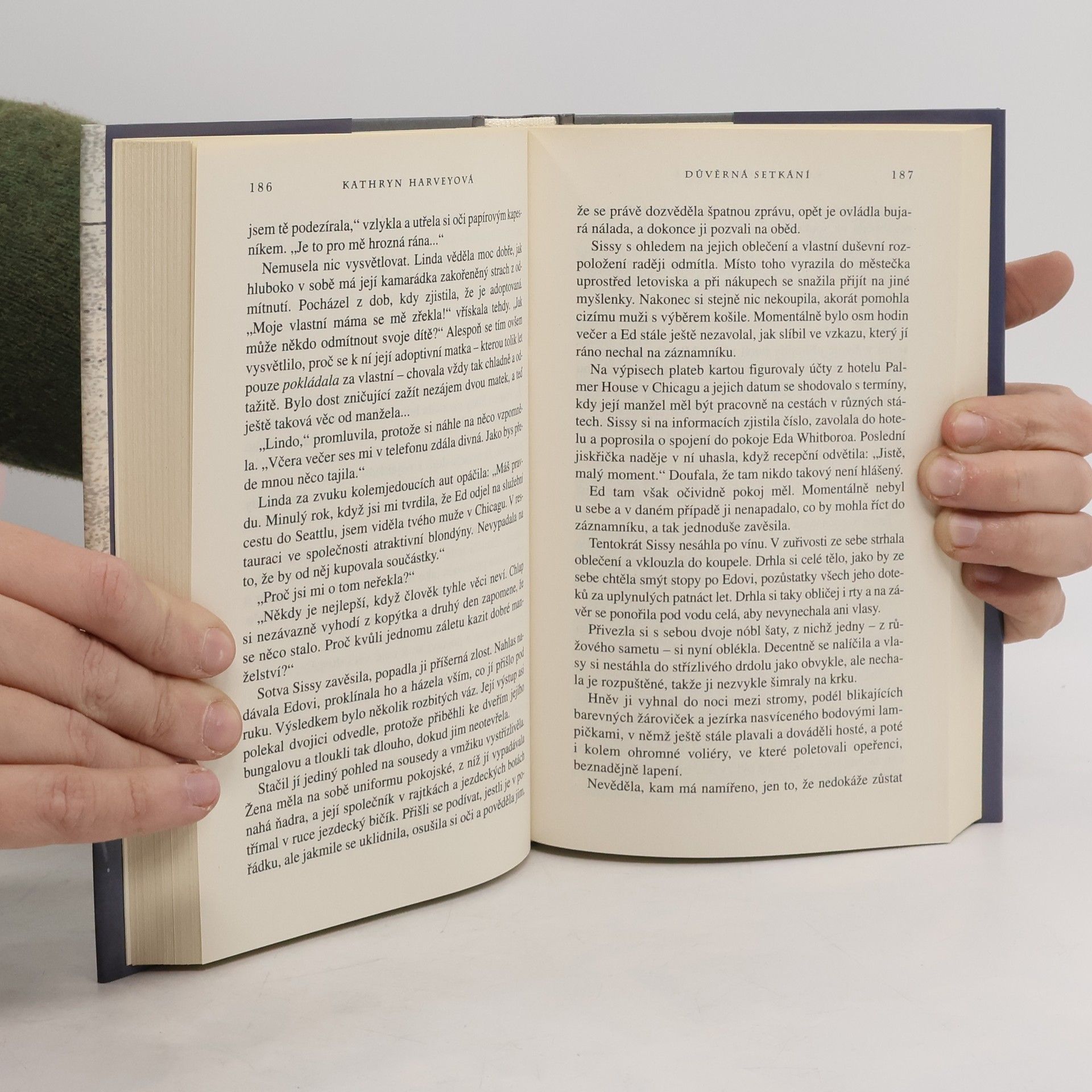 Autorka Barbara Woodová, známá díky románům jako Nespoutané sny a Kruté hvězdy, napsala pod pseudonymem K. Harveyová více než dvacet titulů, které se staly bestsellery a získaly mezinárodní ocenění. Její nejnovější román, Důvěrná setkání, se odehrává v luxusním rekreačním středisku Oáza v kalifornské poušti, kam se lze dostat pouze letadlem. Toto místo, kde je rozkoš prioritou, je domovem tří žen - Coco, Sissy a Ophelia - které se sem dostaly díky neznámé soutěži, o jejíž účasti nemají tušení. Spojuje je tajemný plán hlavní hrdinky, Abby Tylerové, majitelky Oázy, která se snaží najít své dítě, jež jí bylo ukradeno při porodu. Aby se s ním znovu shledala a uzavřela dlouholetou bolest, musí čelit své minulosti. Situace se zkomplikuje s příchodem písečné bouře a najatého vraha, který má své vlastní úmysly. Příběh kombinuje napínavou detektivní zápletku s romantickými a erotickými prvky, které provázejí vývoj vztahů postav. Kathryn Harveyová opět dokazuje svůj talent a schopnost zaujmout čtenáře.
