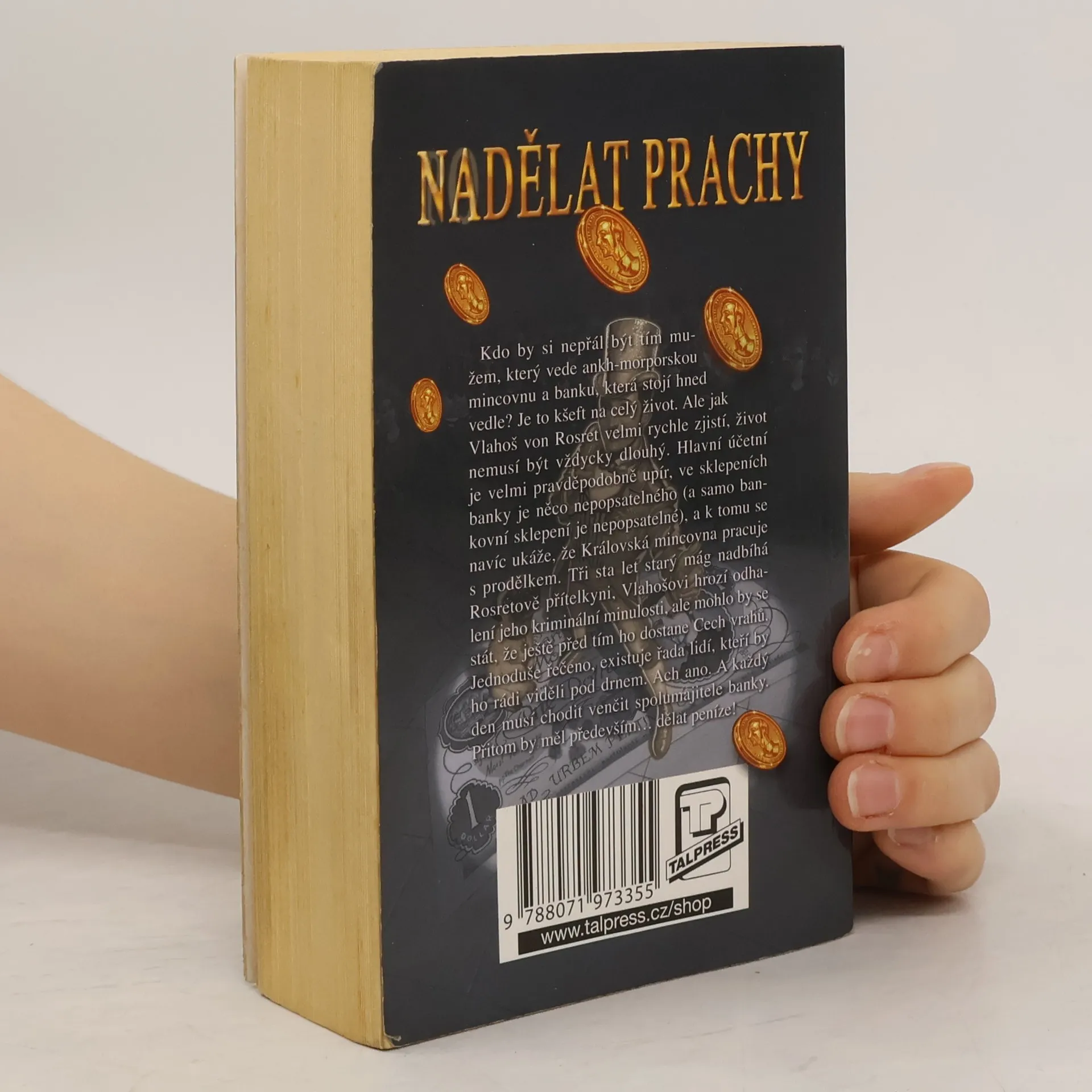 Kdo by si nepřál být tím mužem, který vede ankh-morporskou mincovnu a banku, která stojí hned vedle? Je to kšeft na celý život. Ale jak Vlahoš von Rosret velmi rychle zjistí, život nemusí být vždycky dlouhý. Hlavní účetní je velmi pravděpodobně upír, ve sklepeních banky je něco nepopsatelného (a samo bankovní sklepení je nepopsatelné), a k tomu navíc se ukáže, že Královská mincovna pracuje s prodělkem. Tři sta let starý mág nadbíhá Rosretově přítelkyni, Vlahošovi hrozí odhalení jeho kriminální minulosti, ale mohlo by se stát, že ještě před tím ho dostane Cech vrahů. Jednoduše řečeno, existuje řada lidí, kteří by ho rádi viděli pod drnem. Ach ano. A každý den musí chodit venčit spolumajitele banky. Přitom by měl především... dělat peníze! Úžasná Zeměplocha, kniha 32., přeložil Jan Kantůrek.