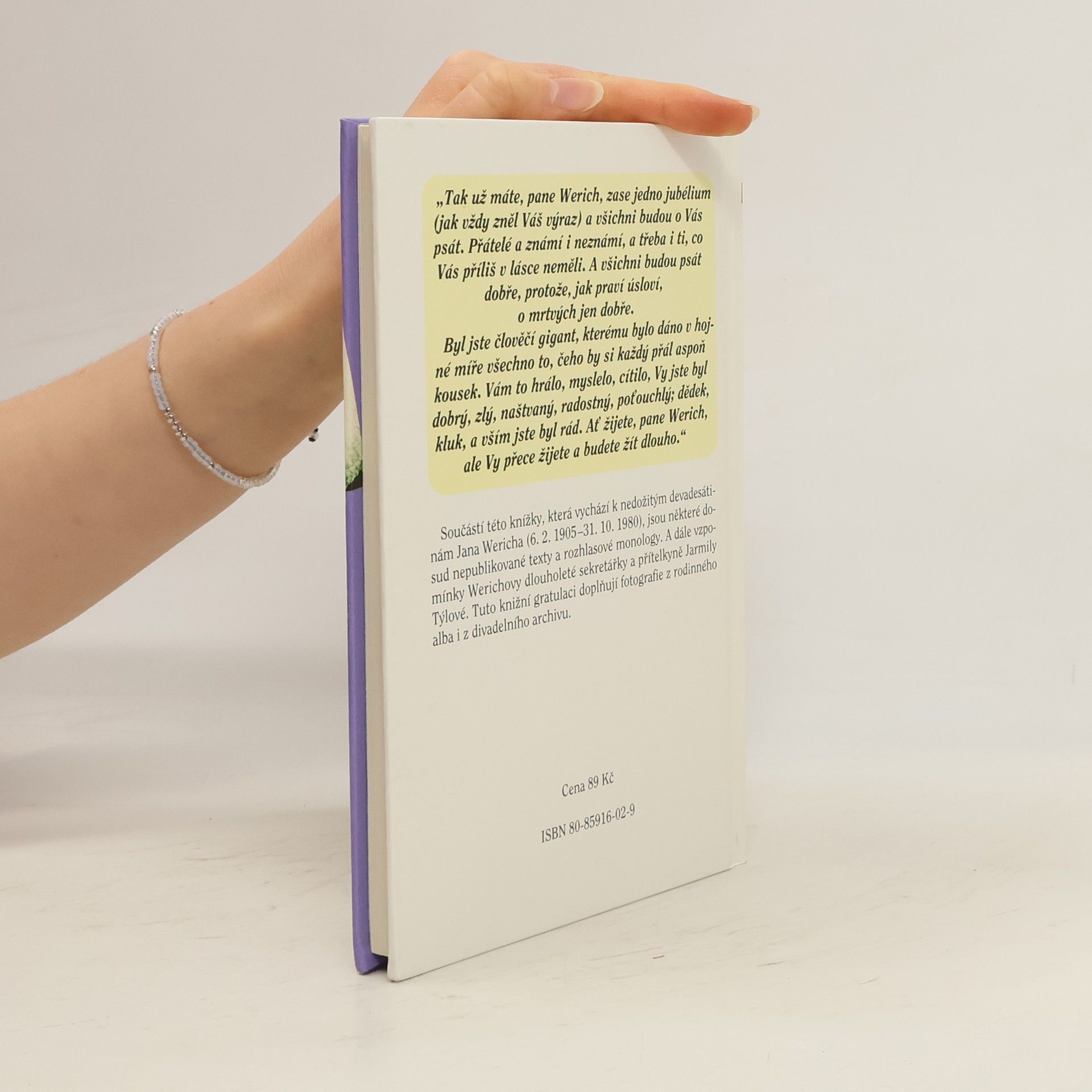 Součástí knížky, která vychází k nedožitým devadesátinám Jana Wericha (6.2.1905-31.10.1980) jsou některé dosud nepublikované texty a rozhlasové monology. A dále vzpomínky Werichovy dlouholeté sekretářky a přítelkyně Jarmily Týlové. Tuto knižní gratulaci doplňují fotografie z rodinného alba i z divadelního archivu.