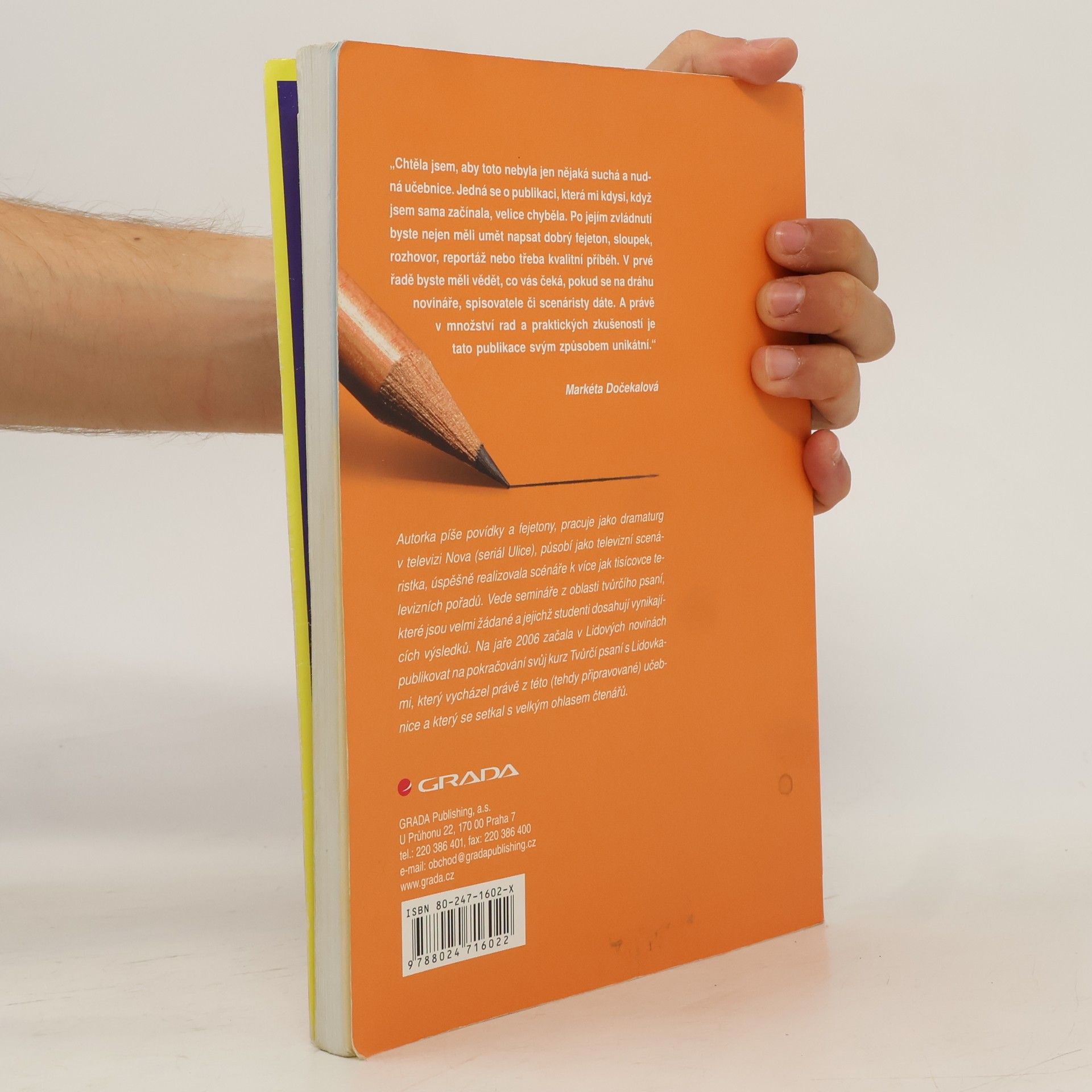 Čtenář se naučí psát a pracovat se svým tvůrčím potenciálem, pozná základní novinářské žánry i principy tvorby příběhů, stavby postav, zvládnutí dialogů a další aspekty tvůrčího psaní. Jde o ryze praktickou a moderní učebnici tvůrčího psaní, která je obohacena o celou řadu praktických cvičení umožňujích čtenářům ověření získaných znalostí a dovedností. Autorka vede semináře z oblasti tvůrčího psaní, které jsou velmi žádané a jejichž studenti dosahují vynikajících výsledků. Na jaře 2006 začala v Lidových novinách publikovat na pokračování svůj kurz Tvůrčí psaní s Lidovkami, který vycházel právě z této (tehdy připravované) učebnice a který se setkal s velkým ohlasem čtenářů. Kromě psaní povídek a fejetonů, pracuje jako dramaturg v televizi Nova (seriál Ulice), působí jako televizní scenáristka, úspěšně realizovala scénáře k více jak tisícovce televizních pořadů.... celý text