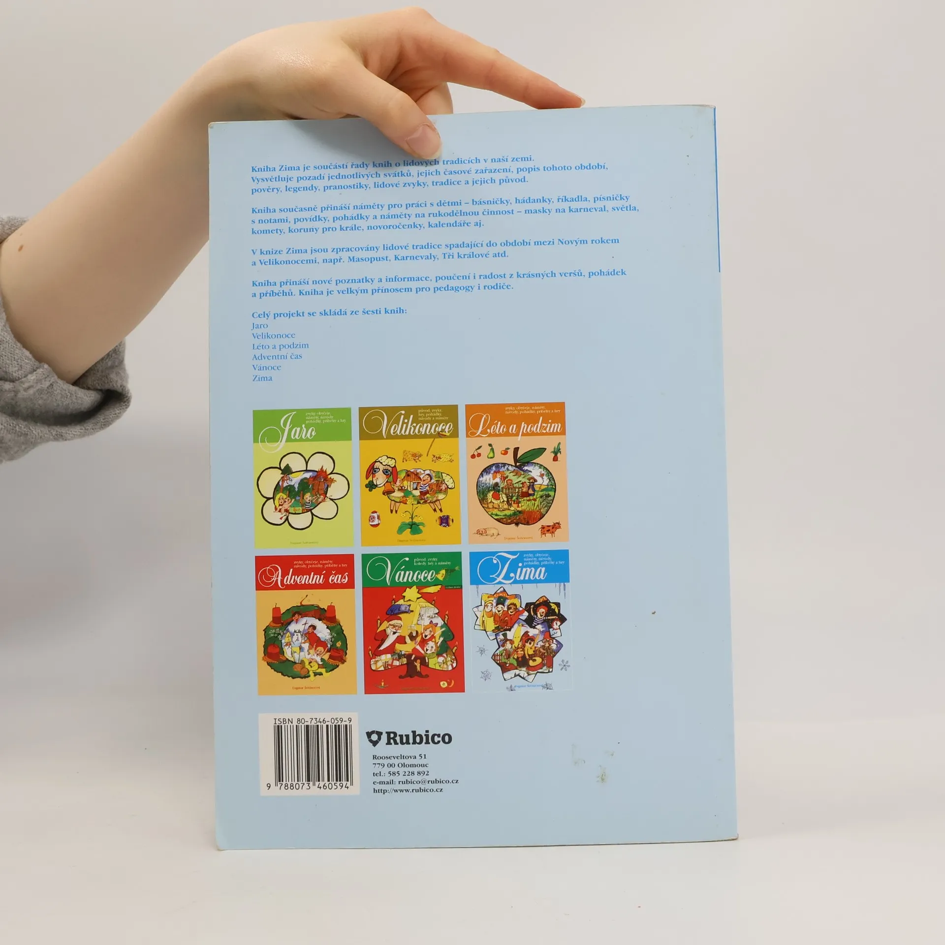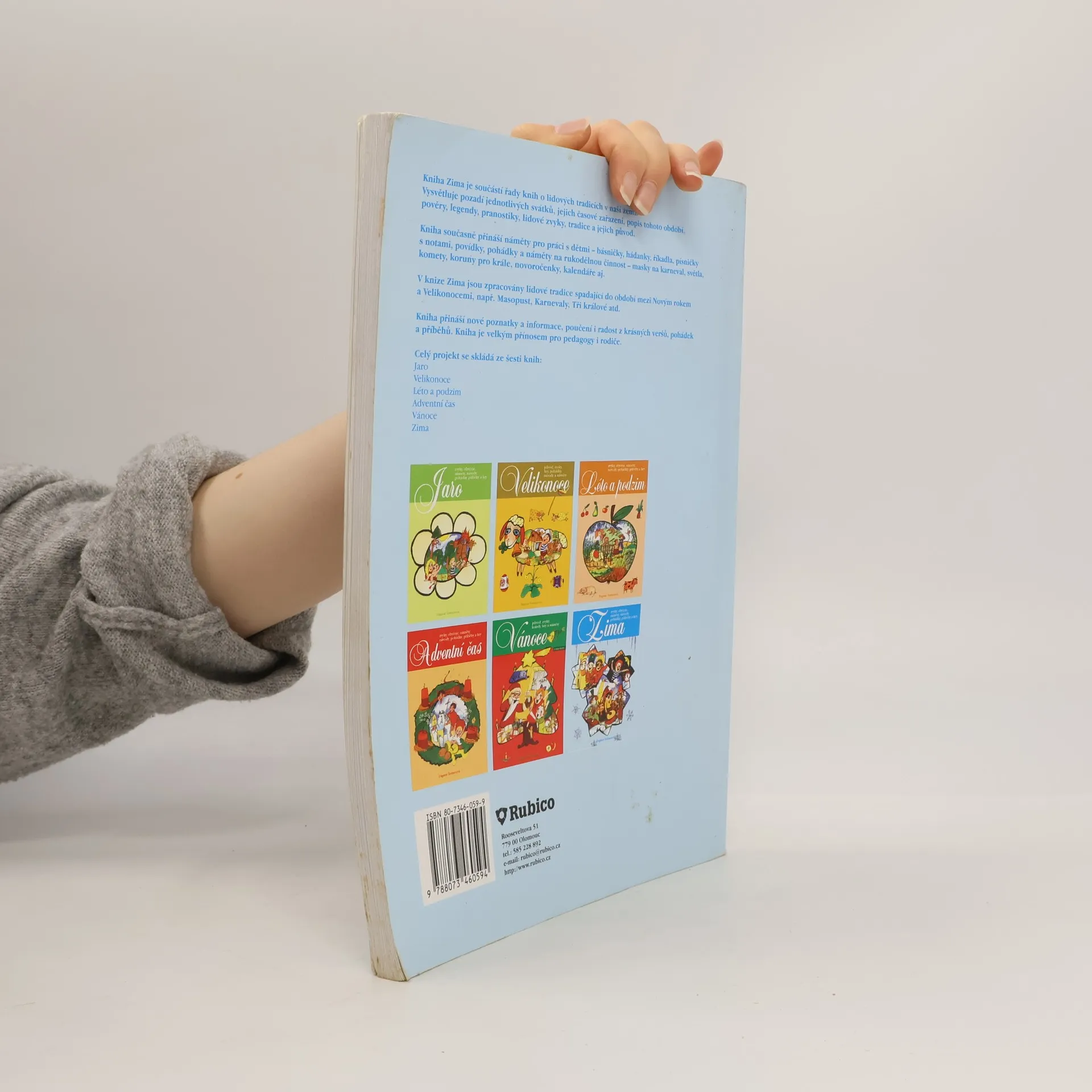 Kniha Zima je součástí řady knih o lidových tradicích v naší zemi. Vysvětluje pozadí jednotlivých svátků, jejich časové zařazení, popis tohoto období, pověry, legendy, pranostiky, lidové zvyky, tradice a jejich původ. Kniha současně přináší náměty pro práci s dětmi - básničky, hádanky, říkadla, písničky s notami, povídky, pohádky a náměty na rukodělnou činnost - masky na karneval, světla, komety, koruny pro krále, novoročenky, kalendáře, aj. V knize Zima jsou zpracovány lidové tradice spadající do období mezi Novým rokem a Velikonocemi, např. Masopust, Karnevaly, Tři králové, atd. Kniha přináší nové poznatky a informace, poučení i radost z krásných veršů, pohádek a příběhů. Kniha je velkým přínosem pro pedagogy i rodiče.