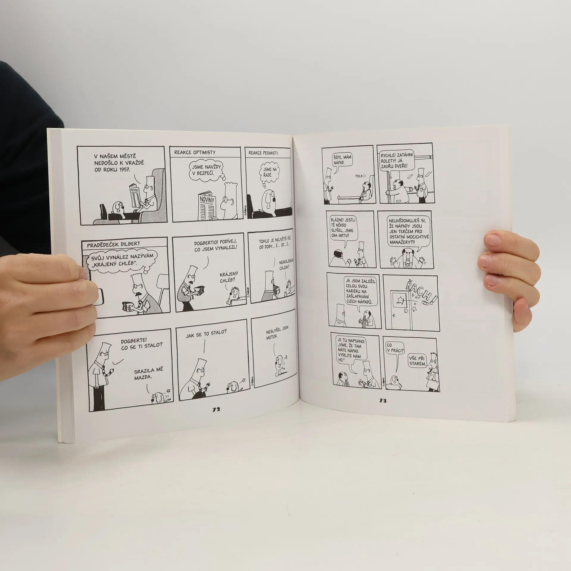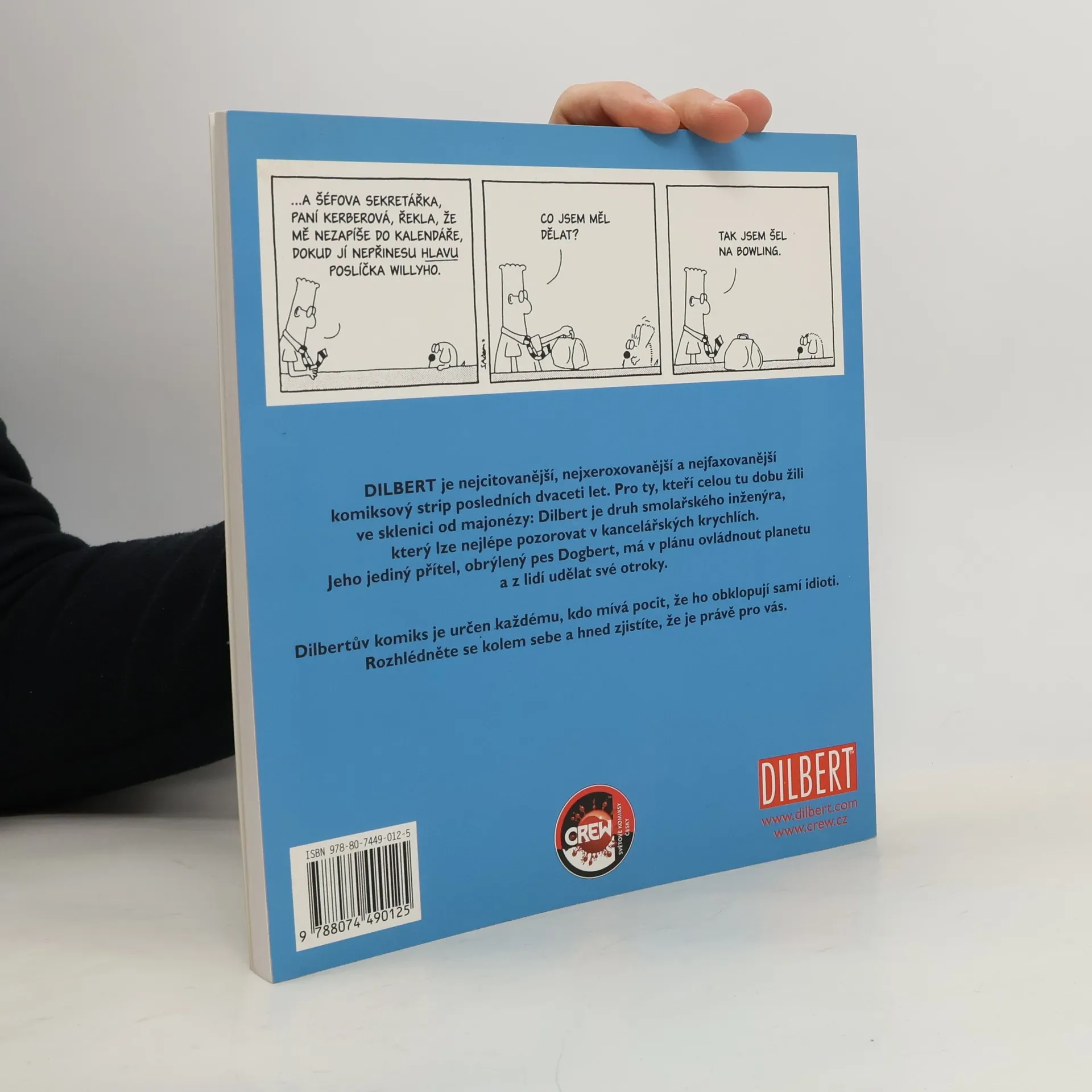 Dilbert je nejcitovanější, nejxeroxovanější a nejfaxovanější komiksový strip posledních dvaceti let. Pro ty, kteří celou tu dobu žili ve sklenici od majonézy: Dilbert je druh smolařského inženýra, který lze nejlépe pozorovat v kancelářských krychlích. Jeho jediný přítel, obrýlený pes Dogbert, má v plánu ovládnout planetu a z lidí udělat své otroky. Dilbertův komiks je určen každému, kdo mívá pocit, že ho obklopují samí idioti. Rozhlédněte se kolem sebe a hned zjistíte, že je právě pro vás.