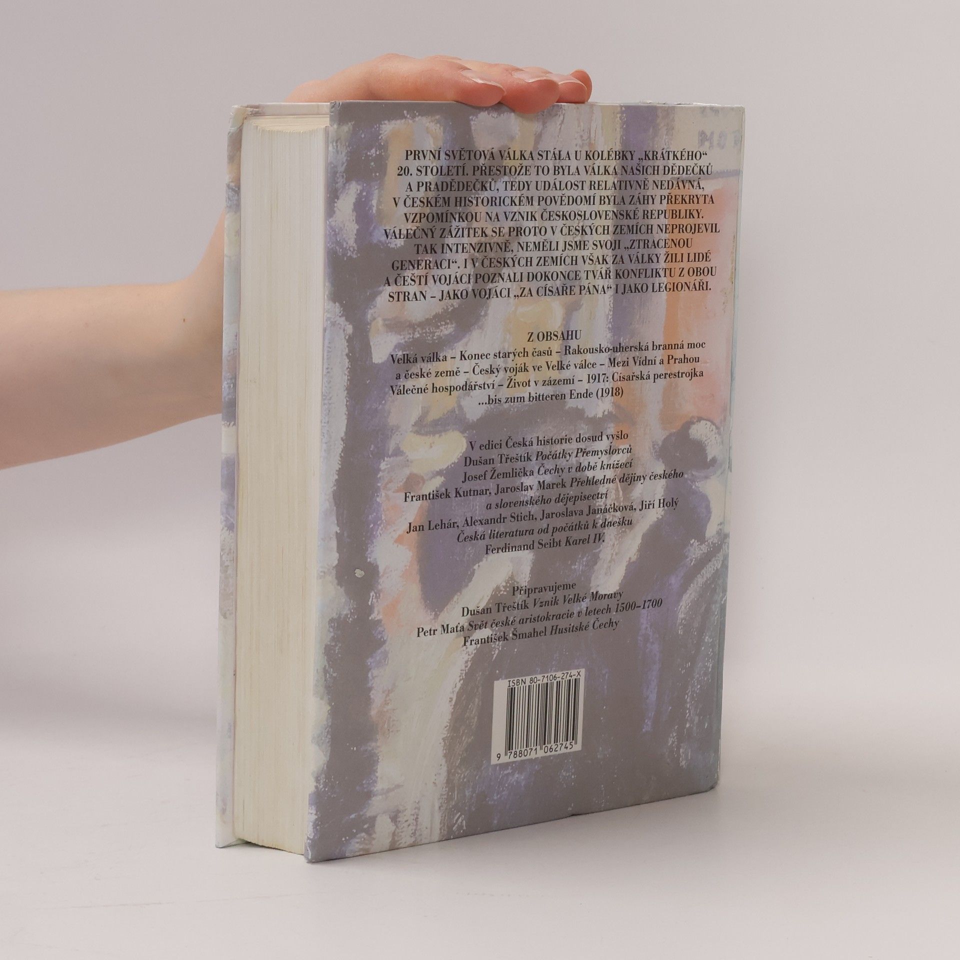 První světová válka stála u kolébky „krátkého“ 20. století. Přestože to byla válka našich dědečků a pradědečků, tedy událost relativně nedávná, v českém historickém povědomí byla záhy překryta vzpomínkou na vznik Československé republiky. I v českých zemích však za války žili lidé, a čeští vojáci poznali dokonce tvář konfliktu z obou stran – jako vojáci „za císaře pána“ i jako legionáři. Ovlivnila válka i českou společnost tak, že to mělo vliv na její další vývoj ve 20. století? Na tuto a podobné otázky se snaží autor odpovědět v knize, v níž části chronologické – od sarajevského atentátu až po rozpad monarchie a vznik samostatného státu – kombinuje s kapitolami, které přibližují hlavní stránky života tehdejší společnosti, hospodářství, kulturu, politickou a sociální každodennost. Jádro práce spočívá v rozboru událostí v zázemí, všímá si také české účasti na válečných operacích.