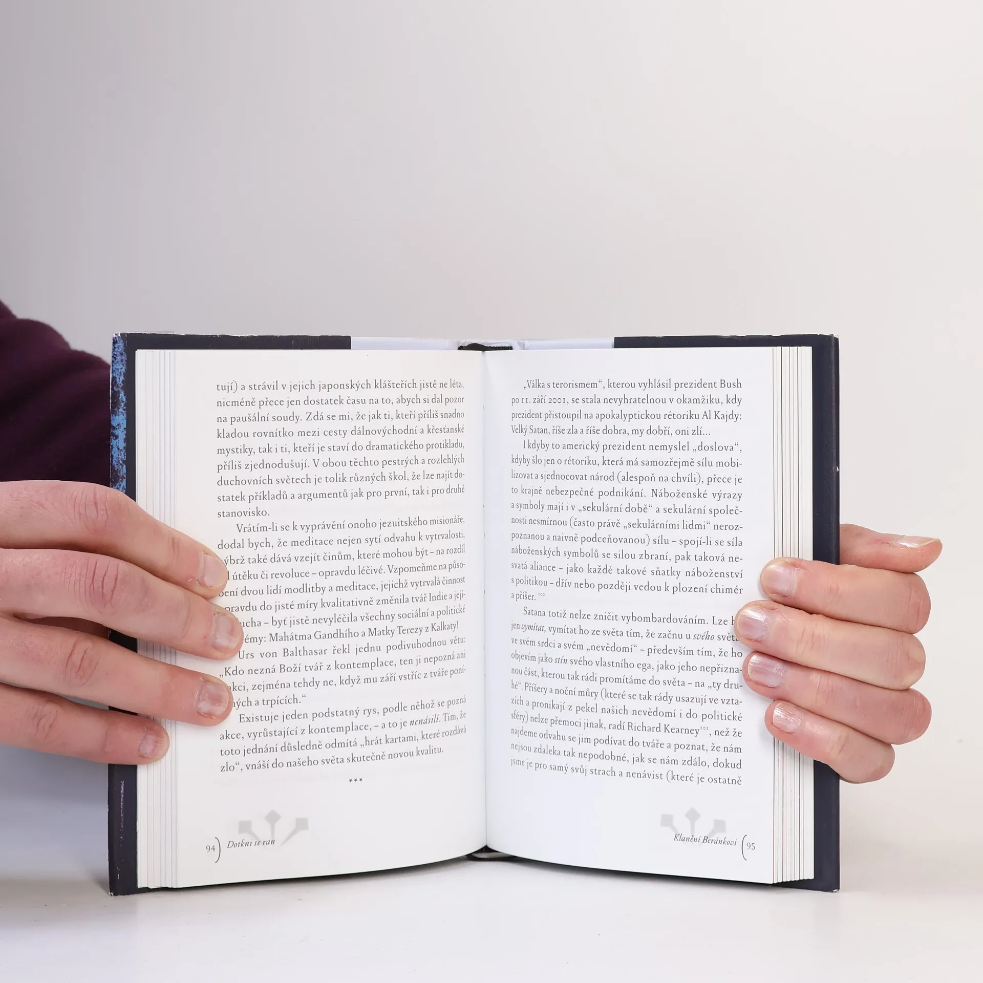Ve čtrnácti esejích autor vychází z evangelijního příběhu o „nevěřícím Tomášovi". Představy o Bohu, církvi a víře „bez zranění" autor považuje za iluze. Ke křesťanské víře patří odvaha vidět rány našeho světa a dotýkat se jich vírou, která sama je jimi zasažena, zraněna. Tváří v tvář „zraněnému Bohu" člověk může odložit „brnění, masky a šminky", jimiž před druhými a někdy sám před sebou zakrývá svá bolestná místa. Kniha obsahuje jak teologicko-filozofické meditace, dotýkající se mystických hloubek víry, tak překvapivé, ostré i místy humorné komentáře konkrétních událostí a typických znaků naší doby. Zdrojem autorovy inspirace je křesťanská i židovská mystika, Pavlova a Lutherova teologie kříže, současná postmoderní filozofie a teologie i poklady staré lidové velikonoční zbožnosti a umění a v neposlední řadě i autorovy vlastní zkušenosti z dlouholeté terapeutické i pastorační praxe.