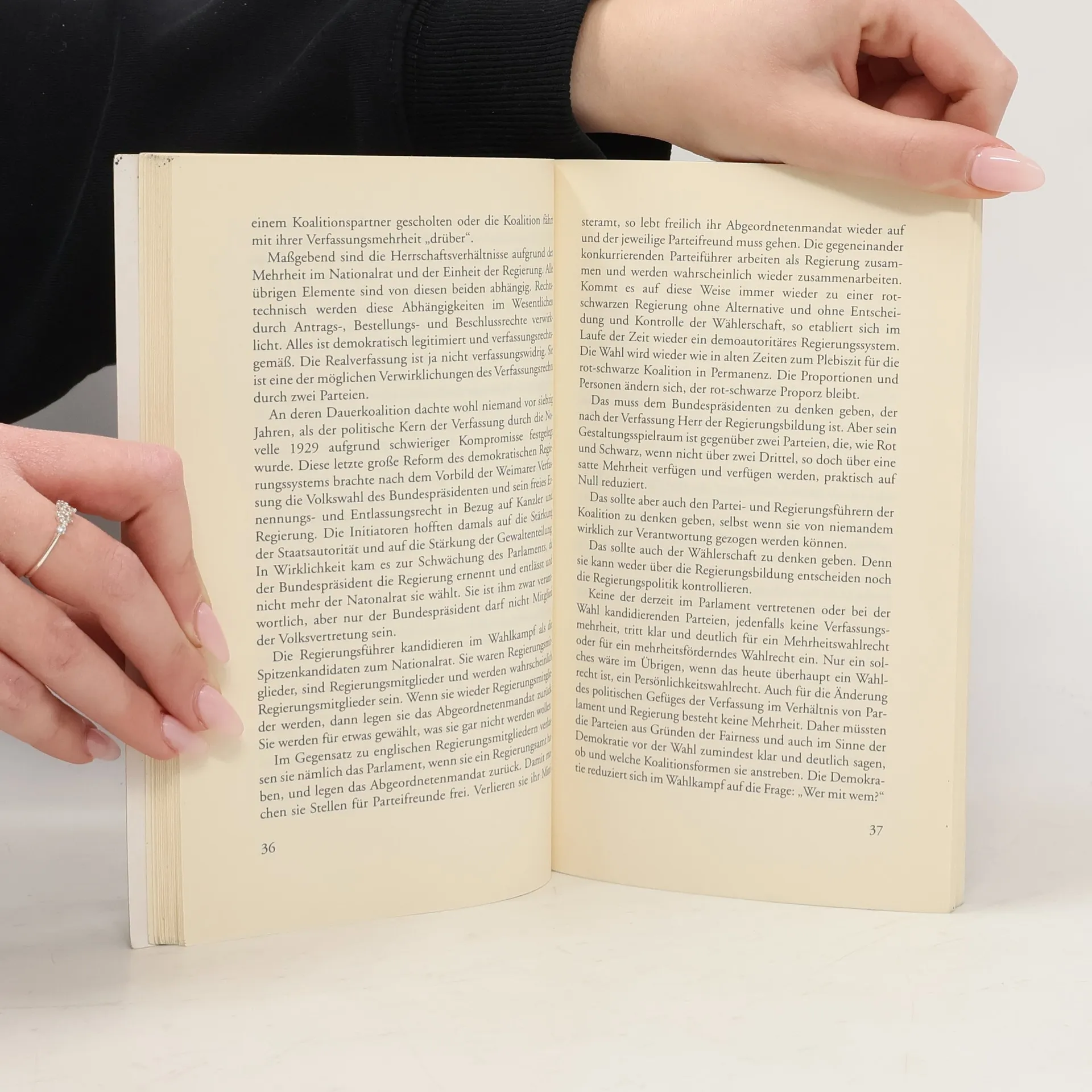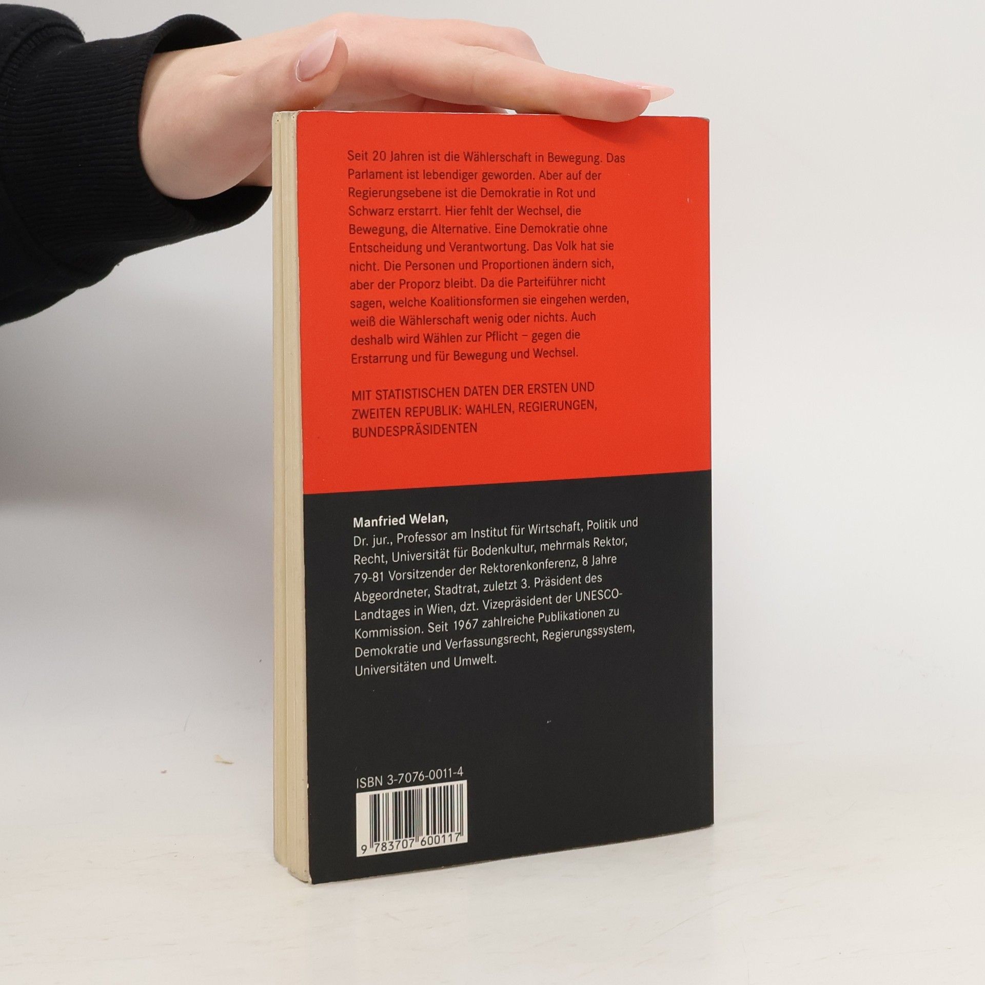 Professor Manfried Welans kurze und schlüssige Analyse des österreichischen Proporzsystems. Seit 20 Jahren ist die Wählerschaft in Bewegung, das Parlament ist lebendiger geworden. Aber auf der Regierungsebene war die Demokratie in Rot und Schwarz erstarrt. Hier fehlte der Wechsel, die Bewegung, die Alternative. Es war eine Demokratie ohne Entscheidung und Verantwortung. Die Personen und Proportionen änderten sich, aber der Proporz blieb. Der mittlerweile prophetisch zu nennende Text über den Regierungswechsel im Gefolge der parteipolitischen Pfründewirtschaft stammt aus dem Herbst 1999, ist aber gerade heute, da sich Postenschacher und Politisierung des Rundfunks angesichts der neuen Regierungszusammensetzung um nichts vermindert haben, unverändert aktuell und brisant. Zusätzlich bietet das Buch einen übersichtlichen statistischen Teil zu Wahlen, Regierungen und Präsidenten der Zweiten Republik. Ein Standardwerk für politisch bewegte Leser.