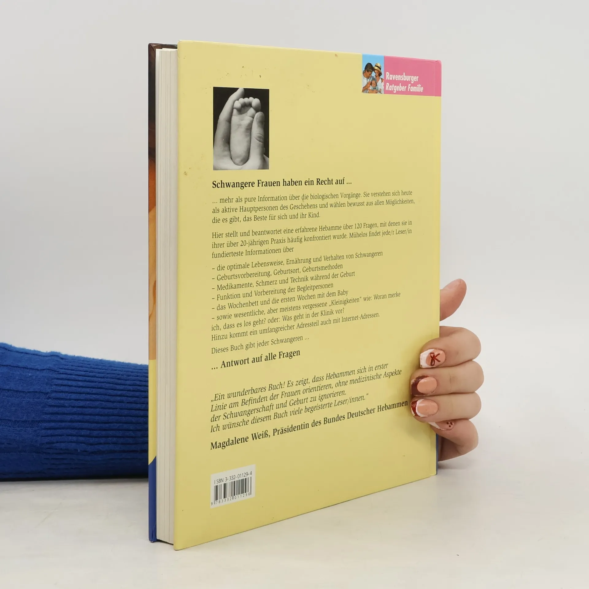 Aus ihrer langjährigen Praxis als Hebamme beantwortet die Autorin 120 Fragen rund um die Geburt: von der geigneten Lebensführung der Schwangeren über Geburtsvorbereitung, -ort und -methode, Geburtsverlauf und Wochenbett bis hin zur ersten Zeit mit dem Baby. Berücksichtigt werden in einem Extrakapitel die Funktion des Partners oder einer Begleitperson während der Geburt sowie ein 14-Punkte-Programm für die Geburts-Erste-Hilfe. Dazu gehören auch ein umfangreicher Adressenteil mit Internetadressen, Bezugsquellen, Register und Glossar. Überschneidungen finden sich zu M. Antonic (BA 8/00), z.B. bei den Illustrationen zur Rückbildungsgymnastik. Auch Fehrenbach wird wie Antonic vom Bund Dt. Hebammen empfohlen. Der ganzheitlich orientierte Ratgeber eignet sich daher gut zur Ergänzung, wenn noch ein Einzeltitel zur Geburt gewünscht ist. Vgl. zuletzt L. Edelmann (BA 19/00), B. Jorda (BA 2/00). (2)