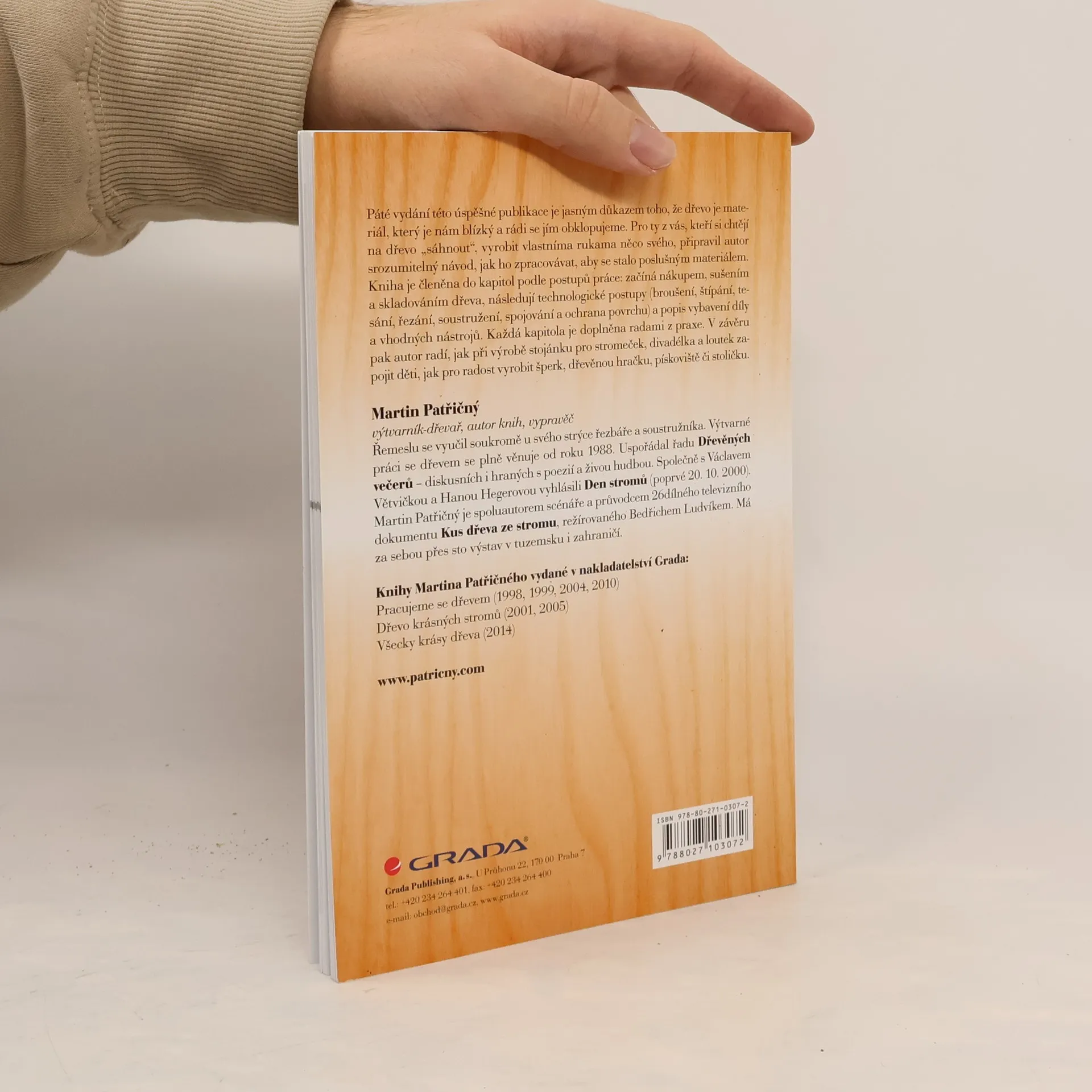 Kniha je členěna do kapitol podle postupů práce: začíná nákupem, sušením a skladováním dřeva, následují technologické postupy (broušení, štípání, tesání, řezání, soustružení, spojování a ochrana povrchu) a popis vybavení díly a vhodných nástrojů. Každá kapitola je doplněna radami z praxe. V závěru pak autor radí, jak při výrobě stojánku pro stromeček, divadélka a loutek zapojit děti, jak pro radost vyrobit šperk, dřevěnou hračku, pískoviště či stoličku. Autor MARTIN PATŘIČNÝ, výtvarník-dřevař, autor knih, vypravěč se řemeslu vyučil soukromě u svého strýce řezbáře a soustružníka. Výtvarné práci se dřevem se plně věnuje od roku 1988. Uspořádal řadu Dřevěných večerů – diskusních i hraných s poezií a živou hudbou. Společně s Václavem Větvičkou a Hanou Hegerovou vyhlásili Den stromů (poprvé 20. 10. 2000). Martin Patřičný je spoluautorem scénáře a průvodcem 26dílného televizního dokumentu Kus dřeva ze stromu, režírovaného Bedřichem Ludvíkem. Má za sebou přes sto výstav v tuzemsku i zahraničí.