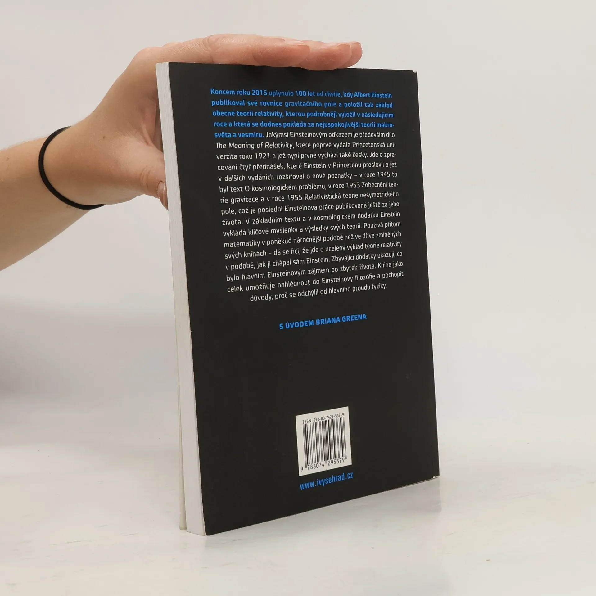 Koncem roku 2015 uplyne 100 let od chvíle, kdy Albert Einstein publikoval své rovnice gravitačního pole a položil tak základ obecné teorii relativity, kterou podrobněji vyložil v následujícím roce a která se dodnes pokládá za nejuspokojivější teorii makrosvěta a vesmíru. Jakýmsi Einsteinovým odkazem je především dílo The Meaning of Relativity, které poprvé vydala Princetonská univerzita roku 1921 a jež nyní prvně vychází také česky. Jde o zpracování čtyř přednášek, které Einstein v Princetonu proslovil a jež v dalších vydáních rozšiřoval o nové poznatky – v roce 1945 to byl text O kosmologickém problému, v roce 1953 Zobecnění teorie gravitace a v roce 1955 Relativistická teorie nesymetrického pole, což je poslední Einsteinova práce publikovaná ještě za jeho života. V základním textu a v kosmologickém dodatku Einstein vykládá klíčové myšlenky a výsledky svých teorií. Používá přitom matematiky v poněkud náročnější podobě než ve dříve zmíněných svých knihách, dá se říci, že jde o ucelený výklad teorie relativity v podobě, jak ji chápal sám Einstein. Zbývající dodatky ukazují, co bylo hlavním Einsteinovým zájmem po zbytek života. Kniha jako celek umožňuje nahlédnout do Einsteinovy filozofie a pochopit důvody, proč se odchýlil od hlavního proudu fyziky.